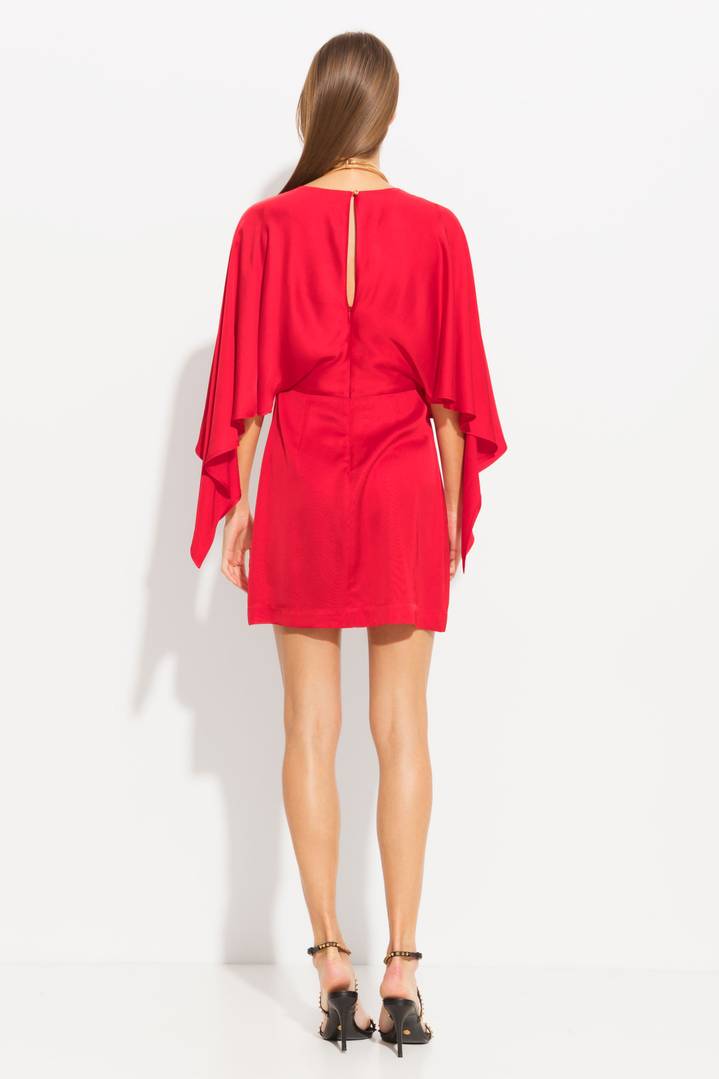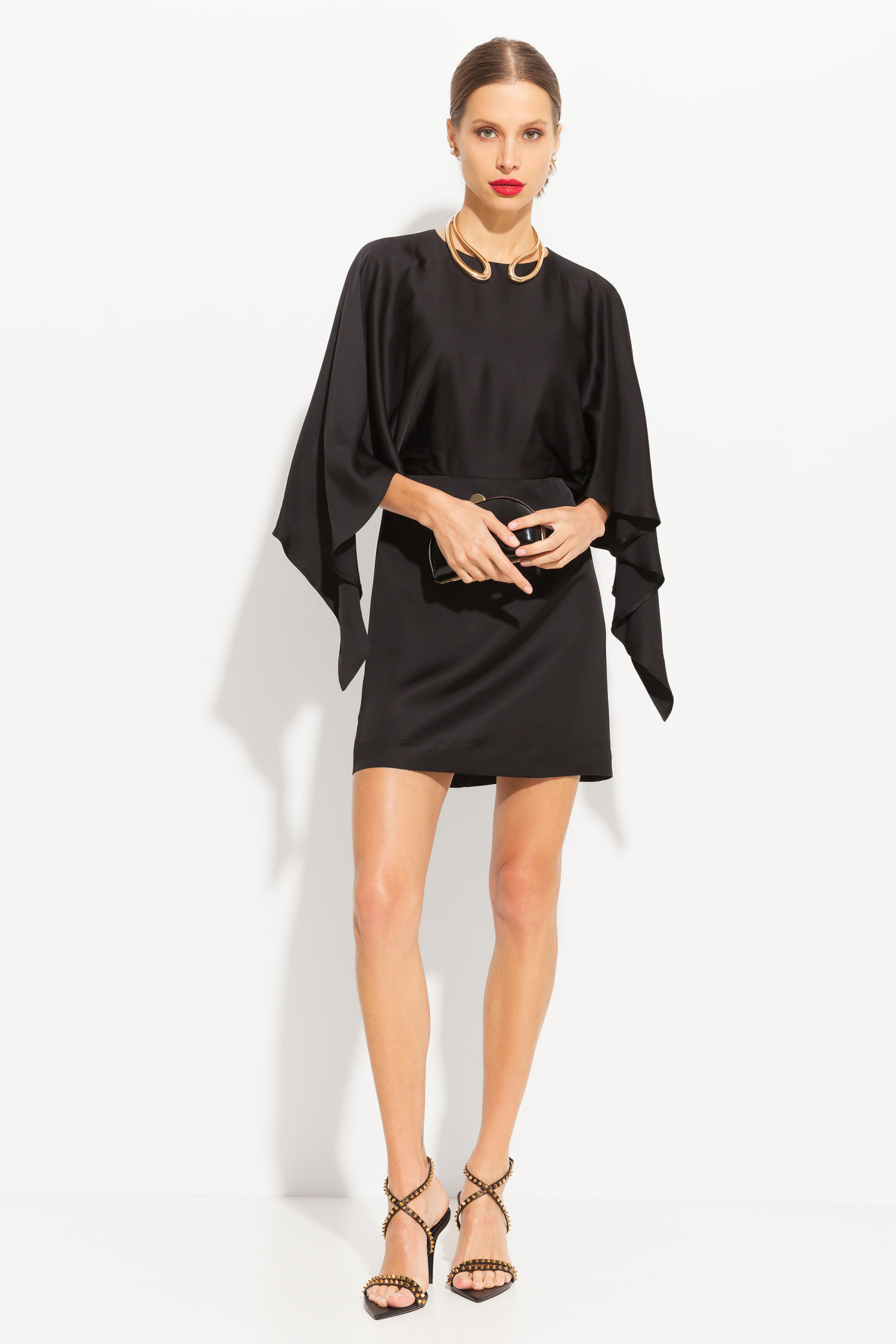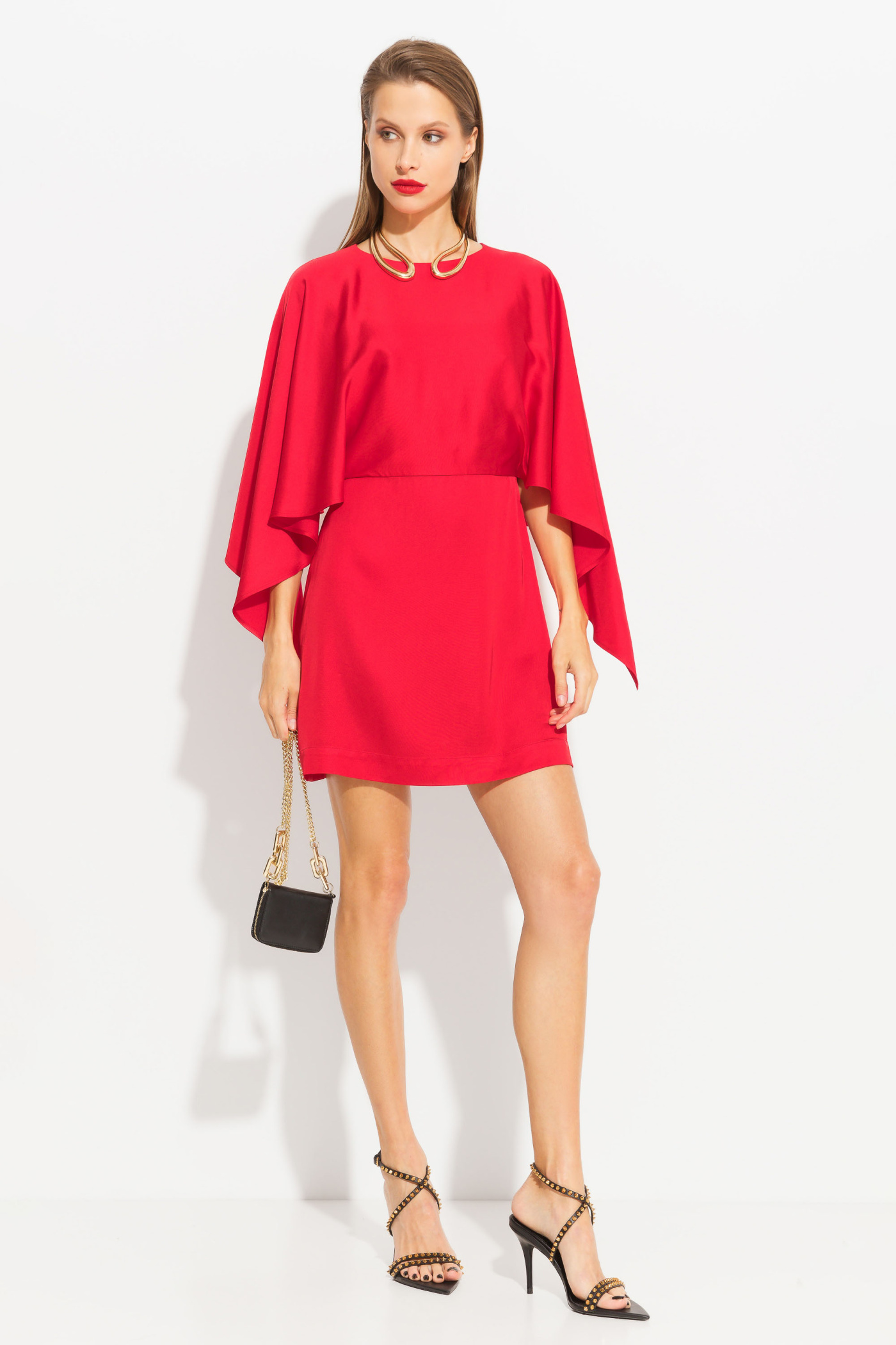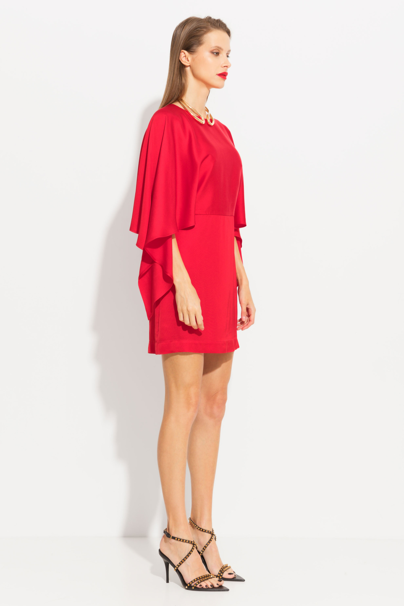 Платье женское, полуприлегающего силуэта, длинной выше колена, с застежкой на потайную тесьму – «молнию» в среднем шве задней части юбки, с пелериной, горловина округлой формы, с застёжкой на навесную петлю и пуговицу. Передние части лифа платья цельные, с нагрудными выточками. Задняя часть лифа платья со средним швом, с талиевыми выточками, с разрезом в верхней части среднего шва. Юбка платья зауженная от линии бёдер к низу. Передняя часть юбки платья цельная. Задние части юбки платья с талиевыми выточками. Пелерина платья цельная. Эффектная модель для неофициальных мероприятий.