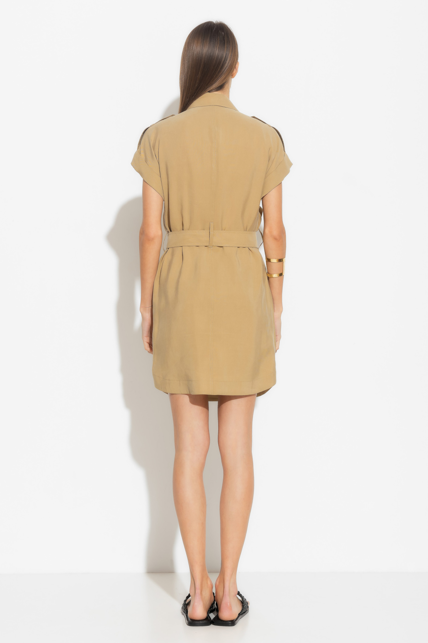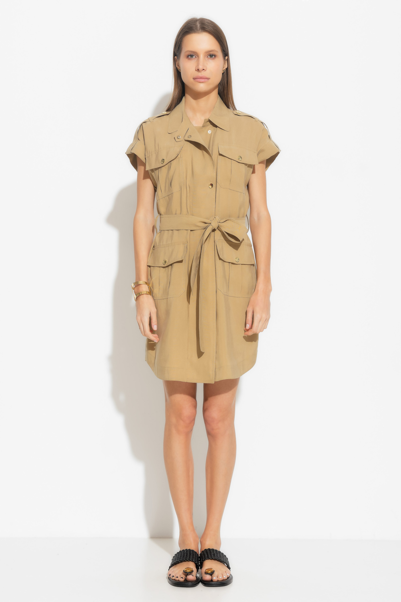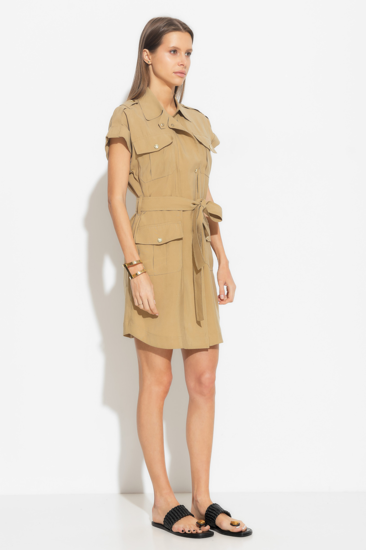 Платье полуприлегающего силуэта и длиной выше колена создает изысканный образ, который подчеркнет вашу женственность. Центральный бортовой заход с тесьмой молнии и кнопкой придает платью утонченность. С цельнокроеными рукавами и воротником на стойке платье выглядит элегантно и модно. Пояс добавляет акцент на талии, подчеркивая вашу фигуру. Накладные карманы "портфели" с клапанами на кнопках на передней части платья придают ему изысканный шарм. Это платье станет прекрасным выбором для особых случаев, где вы хотите выглядеть стильно, изысканно и элегантно.