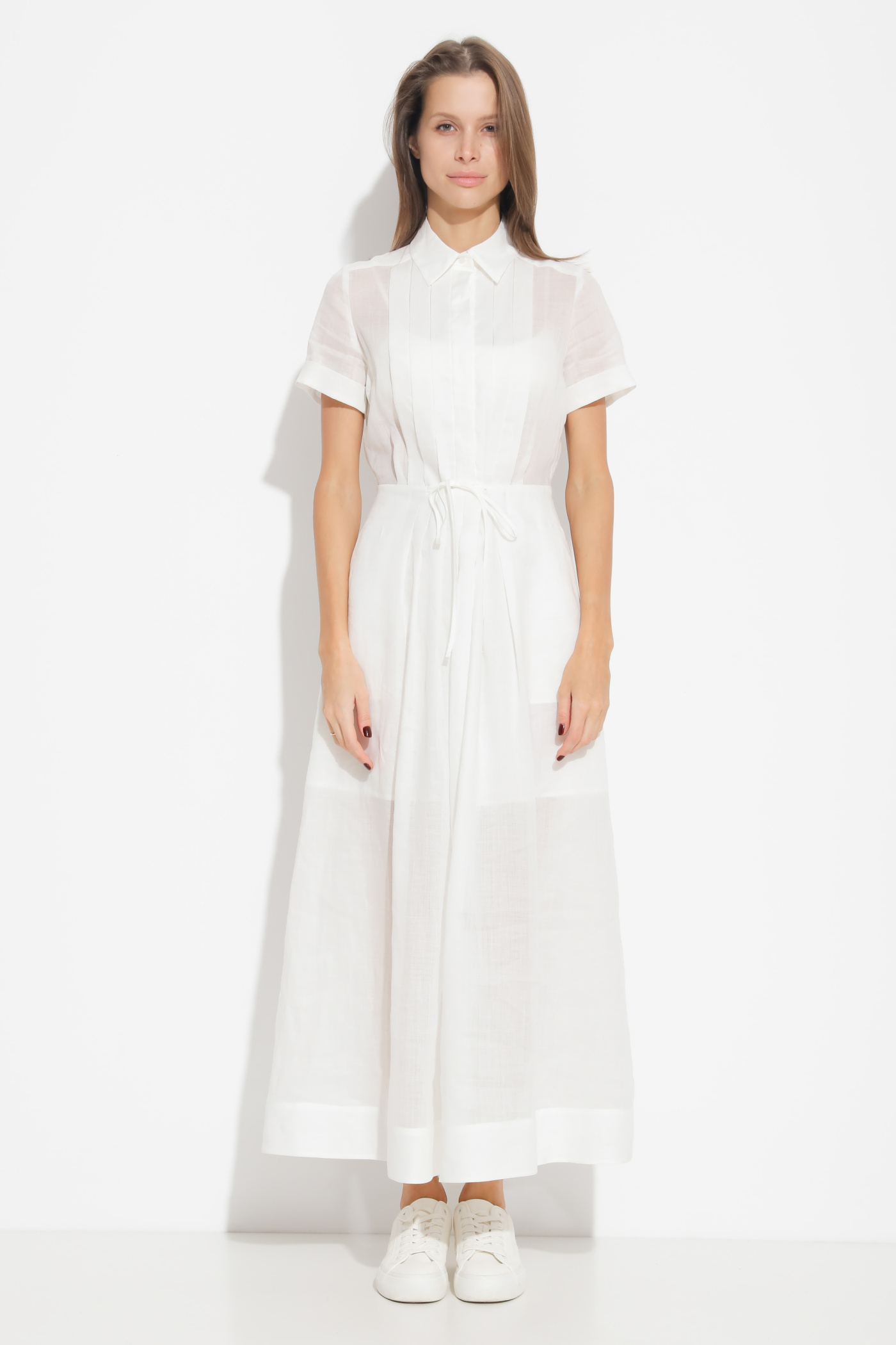 Платье полуприлегающего силуэта, расширенное от линии талии к низу. Воротник стояче-отложной. Линия талии подчеркивается вшитым тонким поясом из аналогичной ткани. По бокам прорезные карманы. Платье выполнено из гипоаллергенной ткани, которая обеспечит комфорт в жаркую погоду. Фасон изделия будет уместен к любому случаю, будь то рабочий образ или неофициальная встреча.