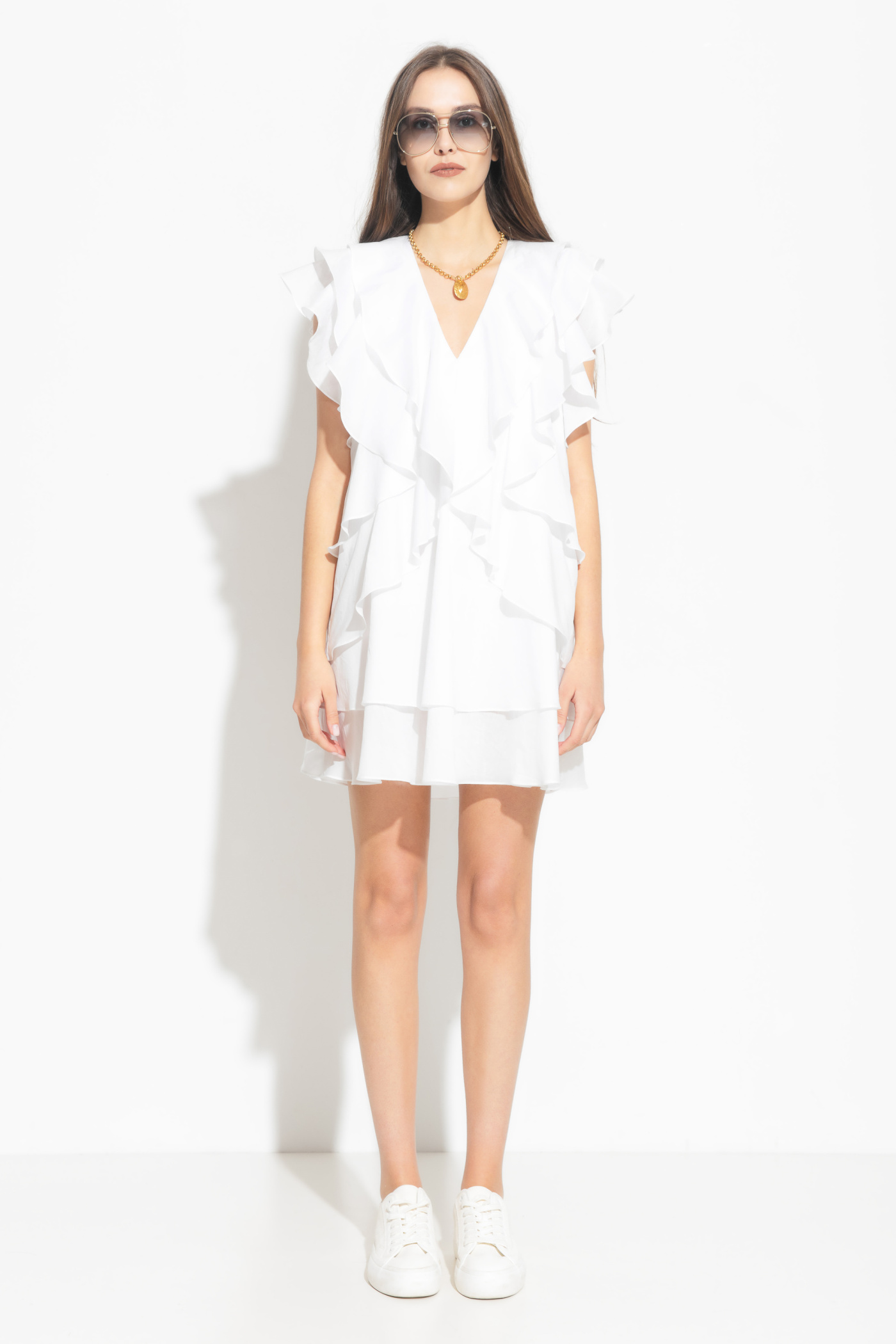 Платье мини свободного кроя. Короткая модель с подрезами и оборками создает игривый и романтичный образ. Верхняя часть платья на подкладке обеспечивает комфорт и удобство ношения. Передняя и задняя части лифа декорированы подрезами, а в швах вставлены изящные оборки, переходящие в горловину. Оборки также украшают швы боковых подрезов и проймы, при этом они обтачены подкладкой для аккуратного завершения. Это платье идеально подойдет для особых случаев, когда хочется выглядеть неповторимо и привлекательно.