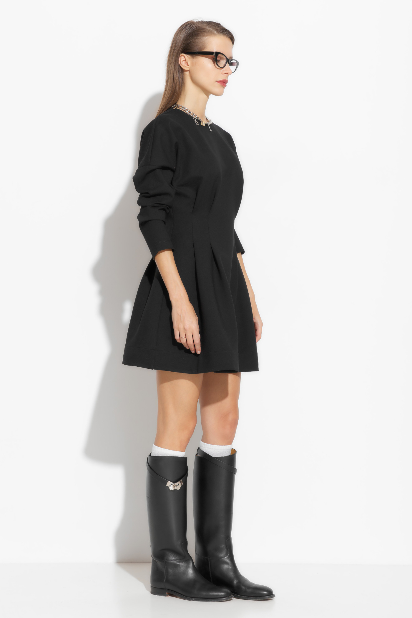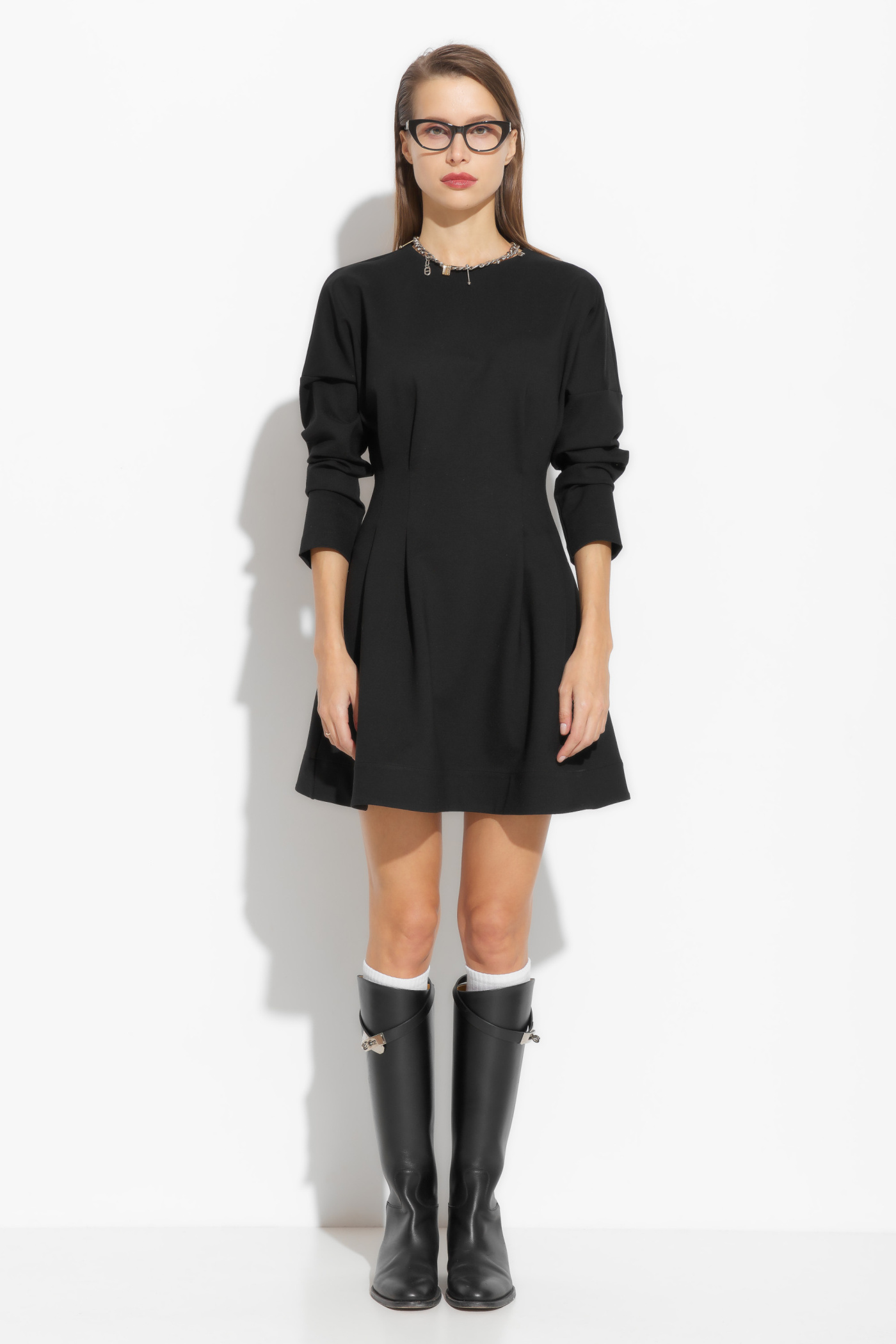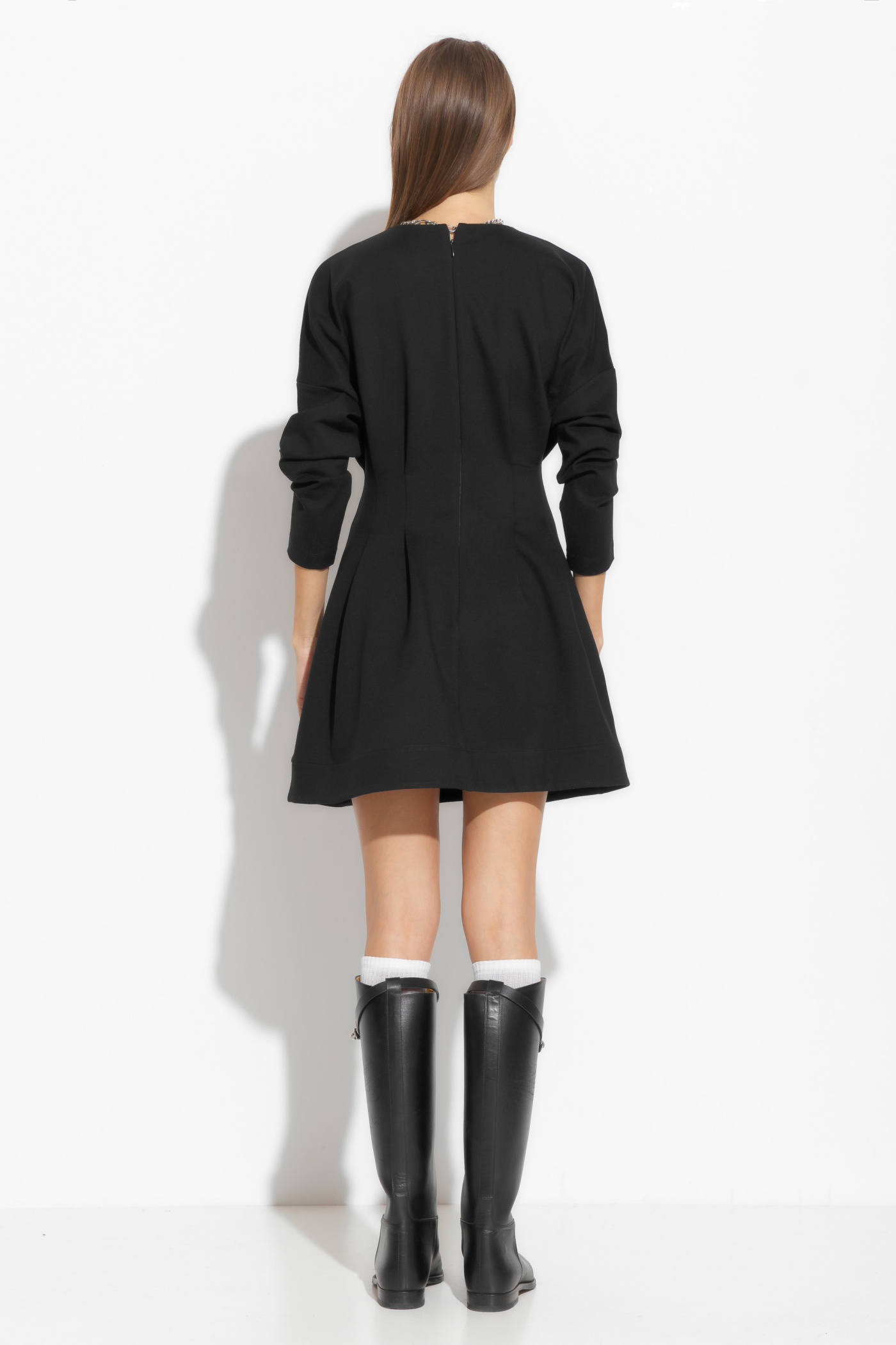 Платье мини полуприлегающего силуэта. Округлый вырез горловины. Линия плеч спущена. Юбка свобдного кроя добавляет образу легкости и романтичности. Универсальная модель, которая подойдет к любому типу гардероба и будет уместна к любому случаю.