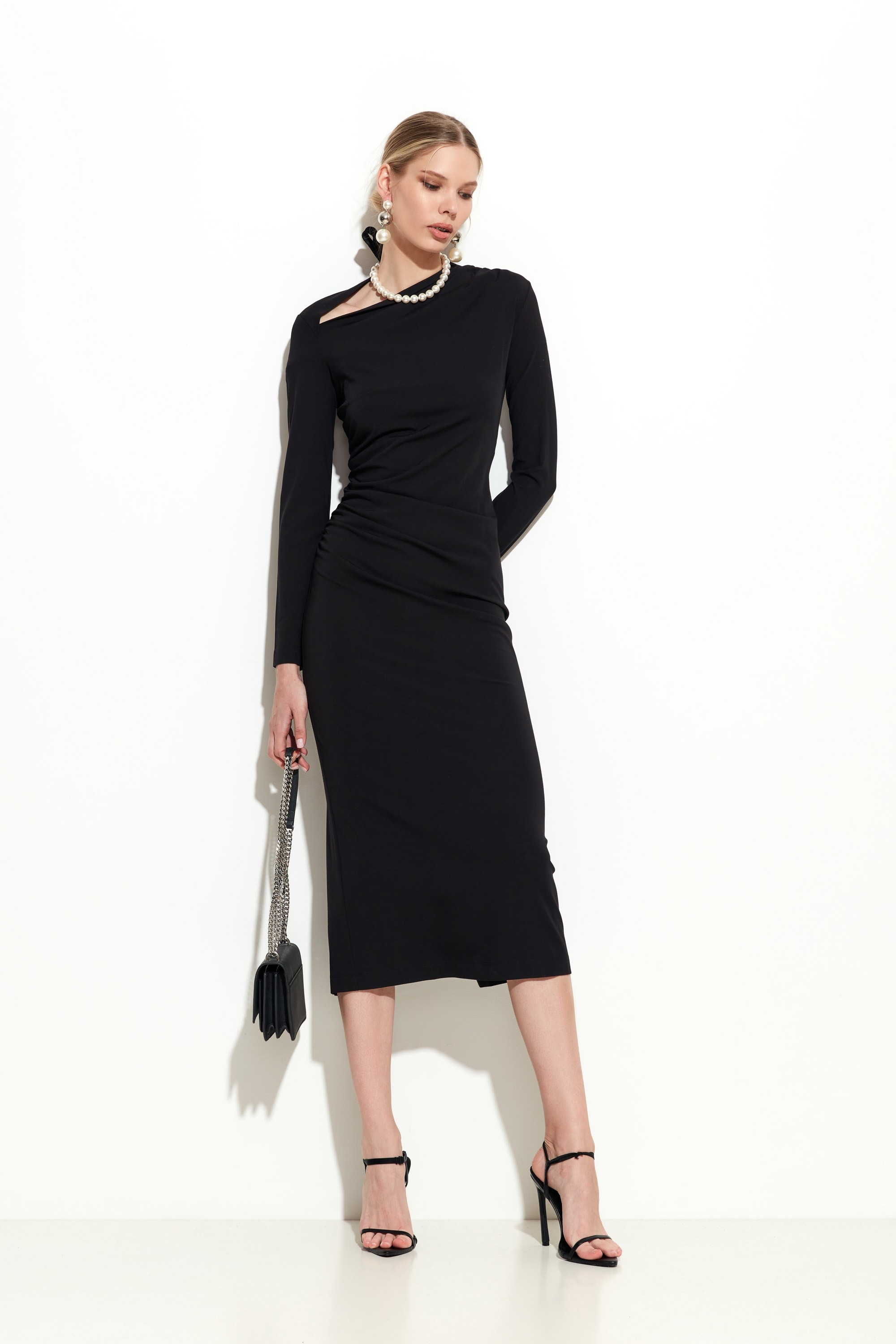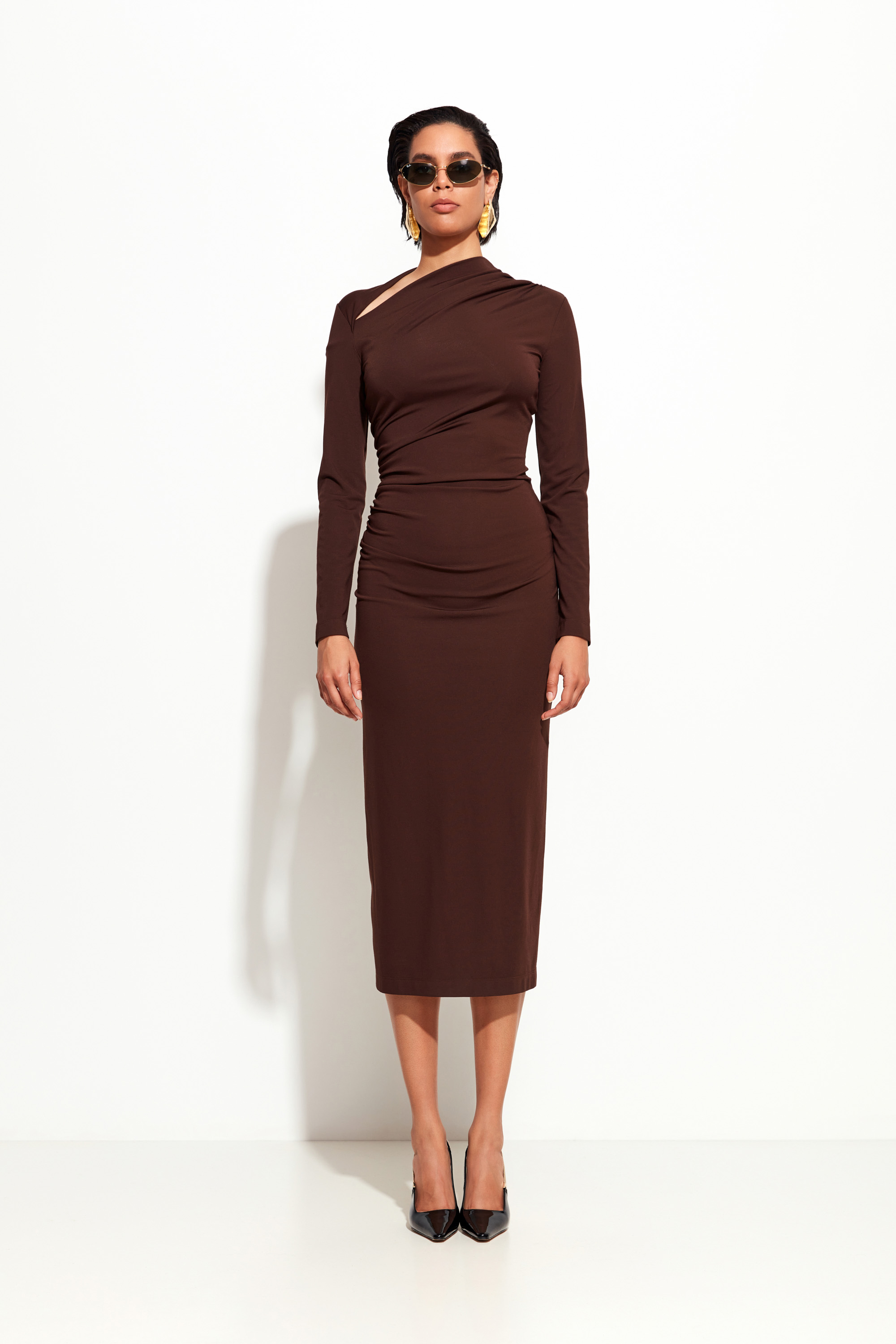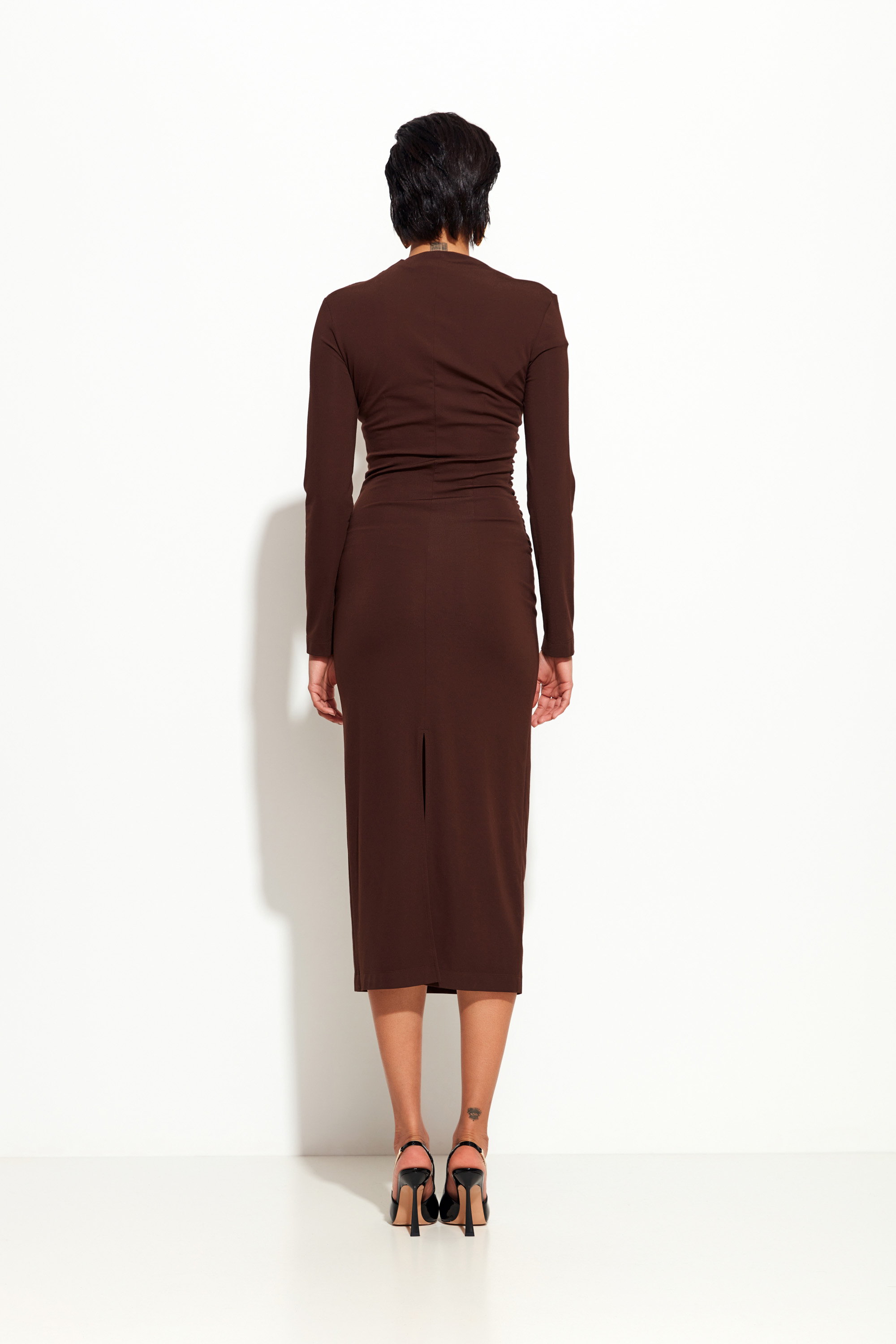 Платье шоколадного цвета Lakbi из коллекции осень-зима 2025/26 — элегантная и стильная модель прилегающего кроя длиной миди, которая подчёркивает женственные линии и создаёт изысканный образ. Особенность платья — оригинальный фигурный вырез горловины, придающий нежность и выразительность, а также визуально удлиняющий шею. Модель выполнена из качественной ткани с лёгким матовым эффектом, комфортной для носки в холодный сезон.