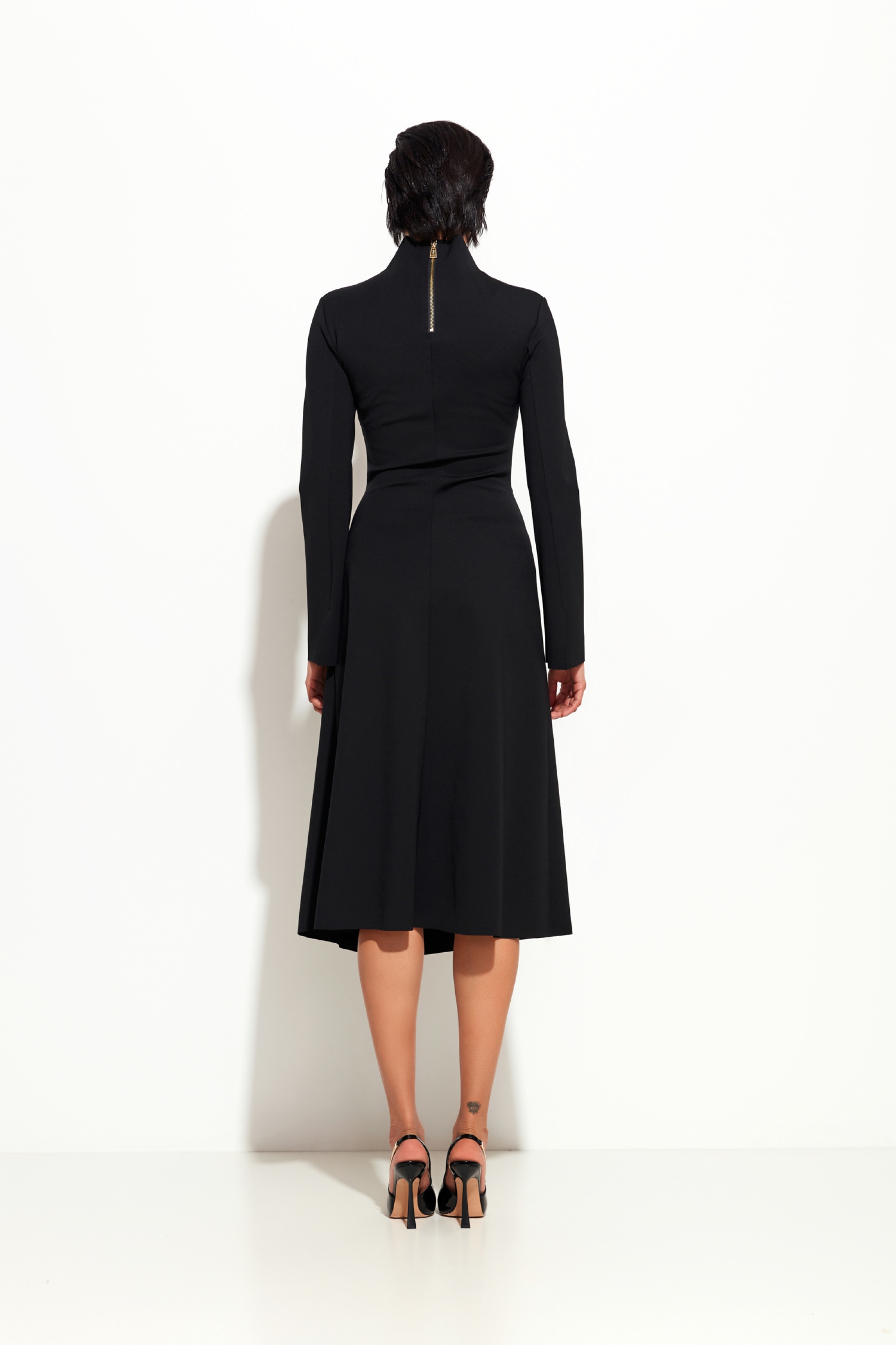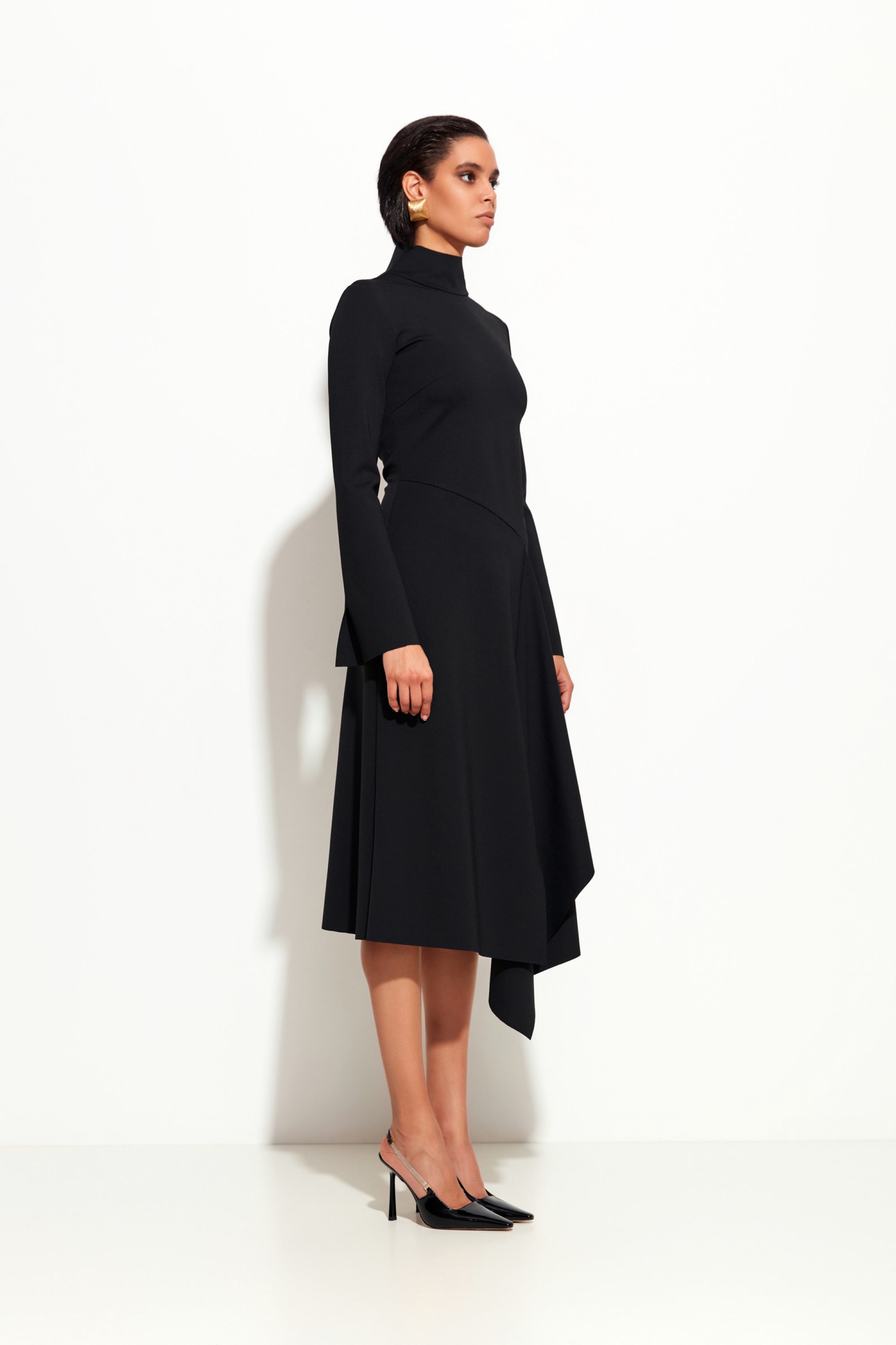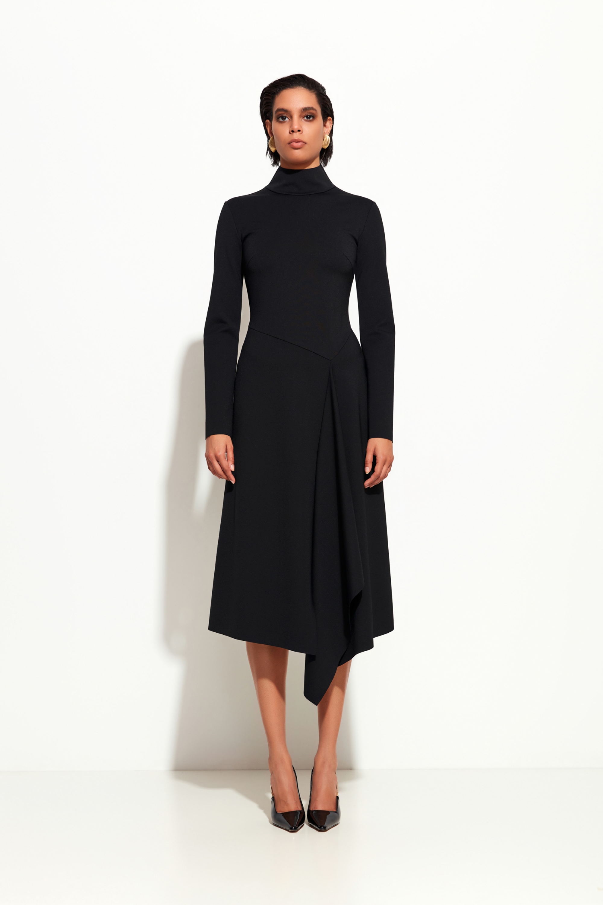 Платье Lakbi из коллекции осень-зима 2025/26 — лаконичная и выразительная модель длины миди с высокой горловиной.