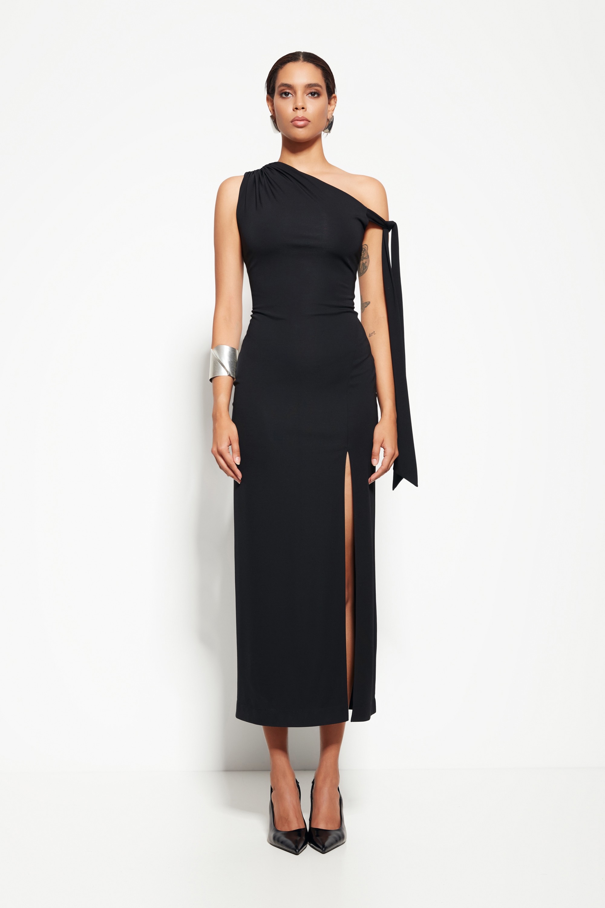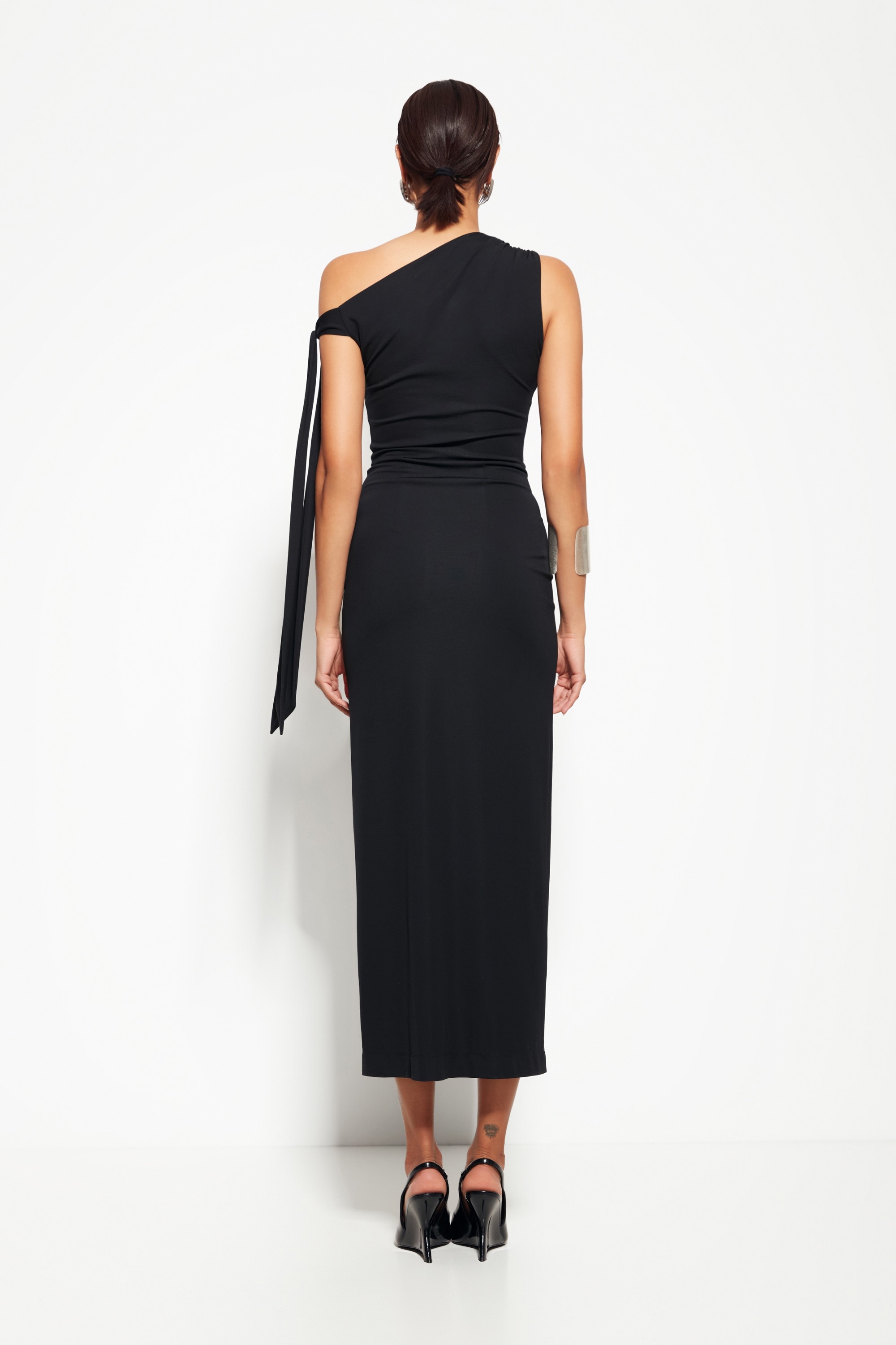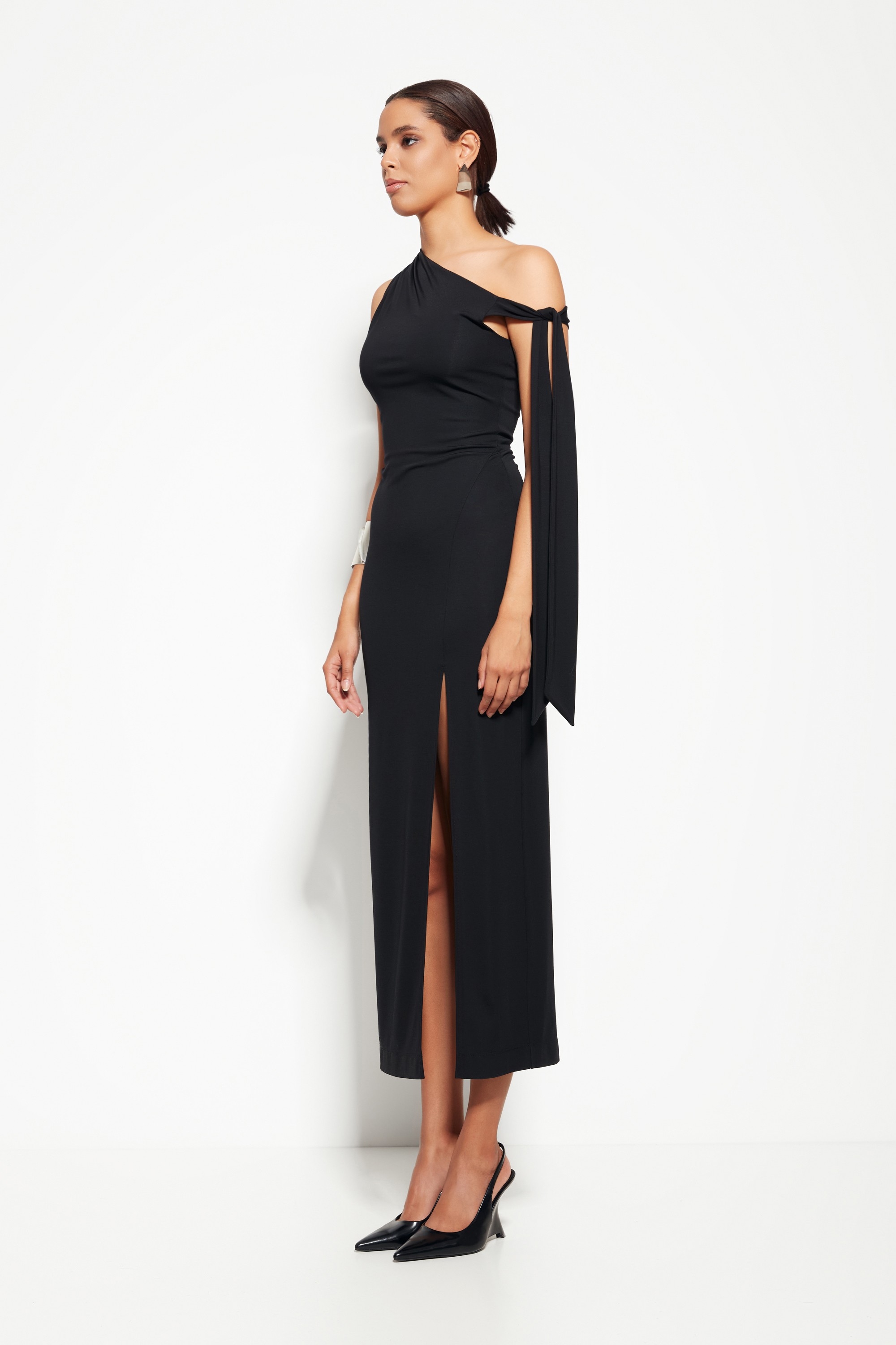 Дизайн: Разные бретели, одна из которых с длинным шлейфом, и разрез спереди создают эффектный и запоминающийся образ.