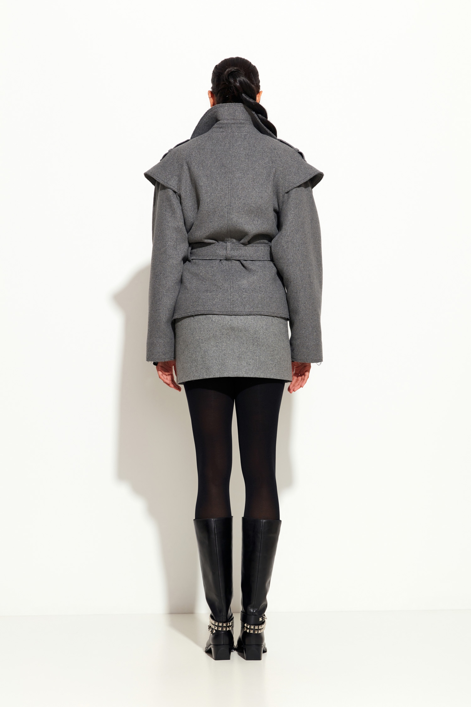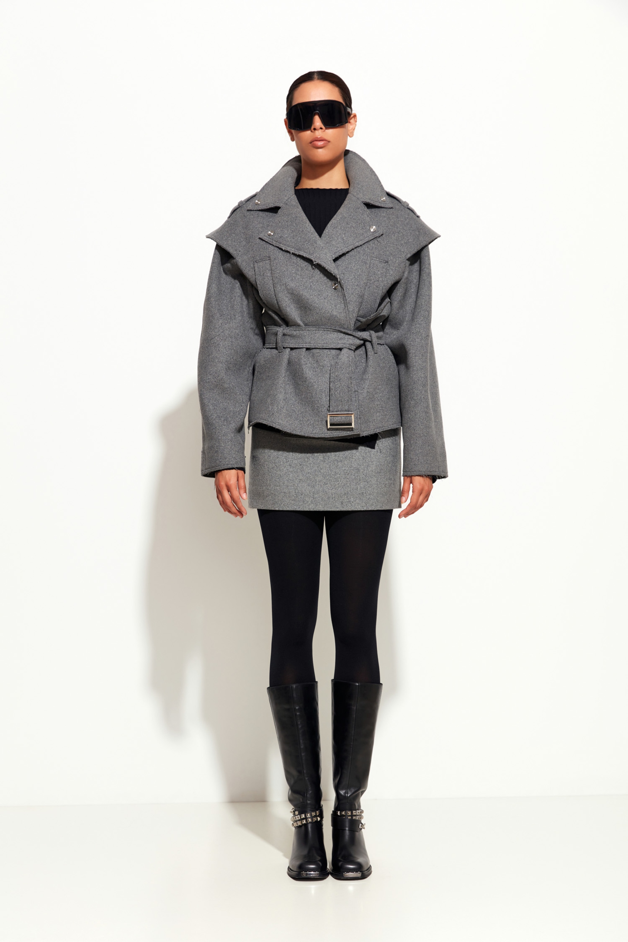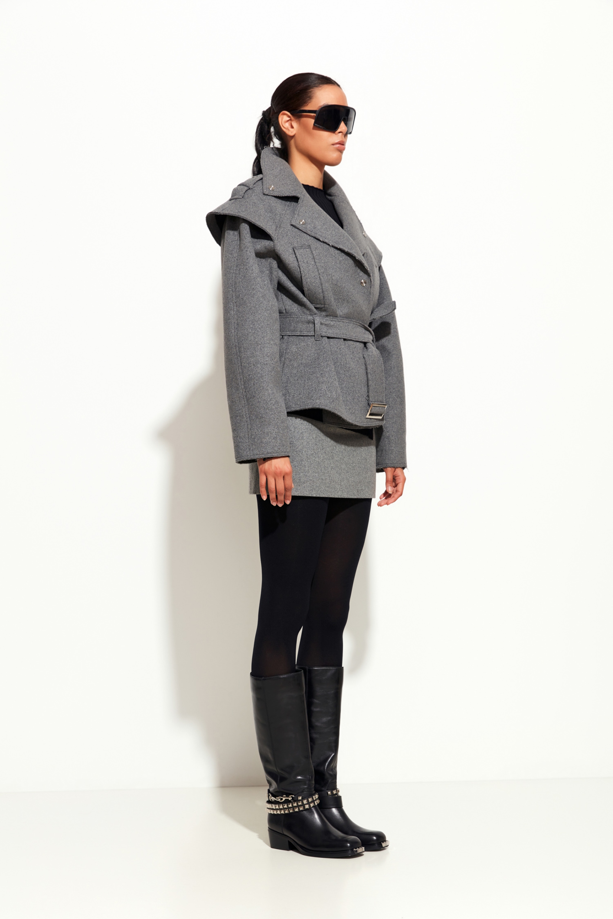 Серое полупальто Lakbi из коллекции осень-зима 2025/26 — стильная модель из качественной шерстяной ткани, которая сочетает в себе тепло и утончённый дизайн. Особенность полупальто — расширенная линия плеч, создающая выразительный и современный силуэт. Модель средней длины обеспечивает комфорт и защиту в прохладную погоду, а благородный серый цвет легко сочетается с разными элементами гардероба.