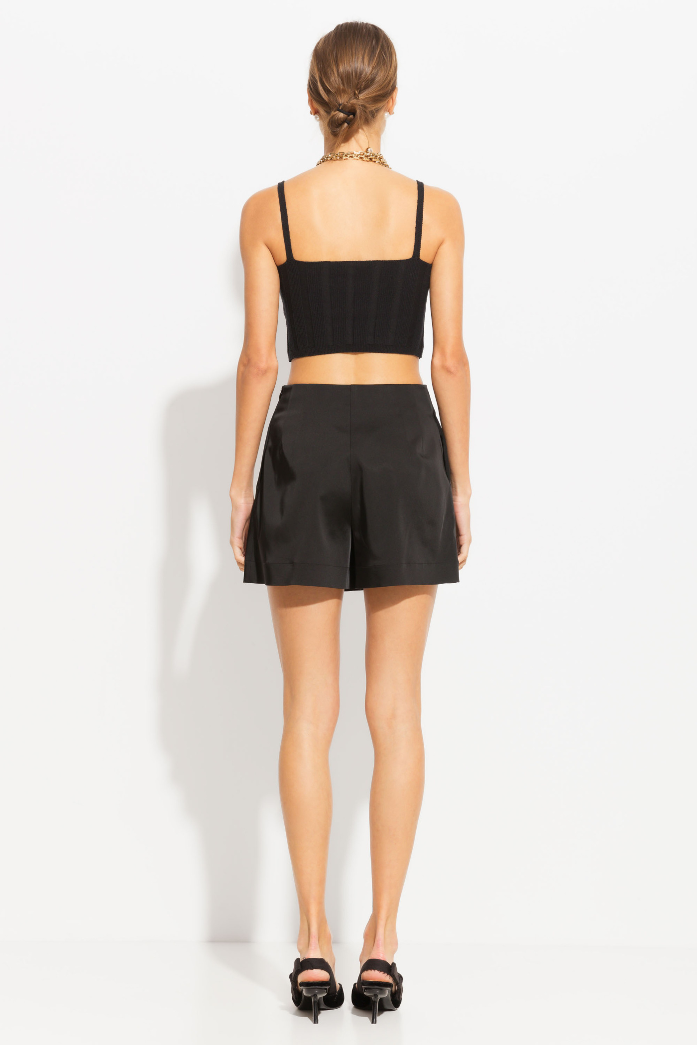Шорты мини прямого кроя. Изделие с прорезным карманом. Перед декорирован тканью из аналогичной ткани. Посадка изделия средняя. Универсальная модель, которая подойдет к любому типу гардероба и по любому случаю. Текстура ткани с блеском в любой аутфит добавит праздничности и эффектности.