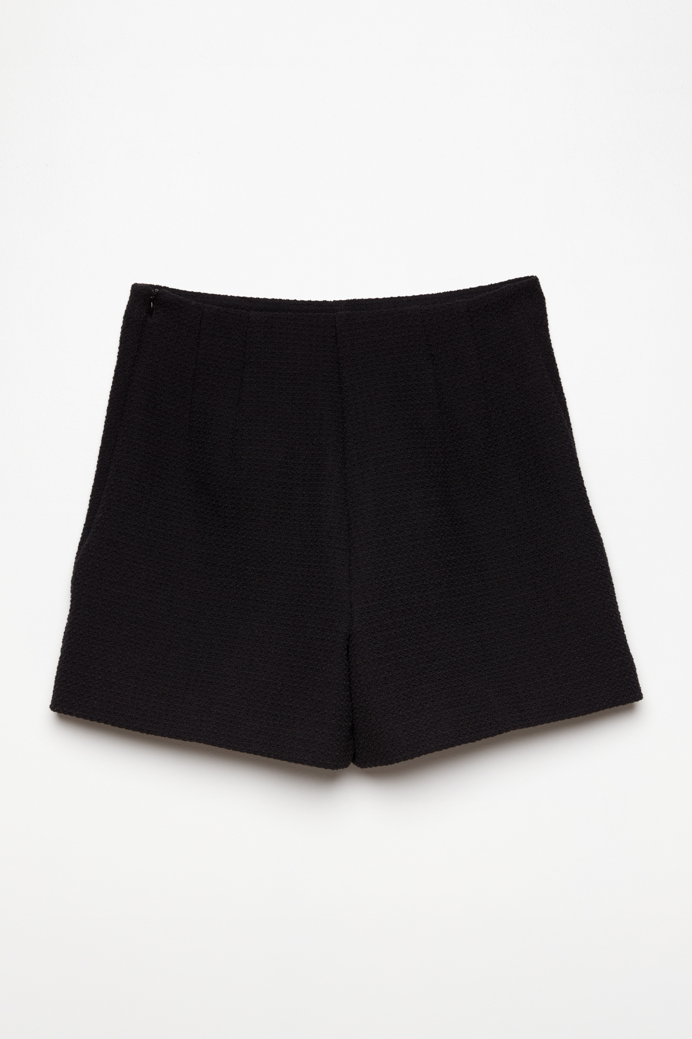 Шорты мини твидовые. Посадка изделия высокая. Перед декорирован накладными карманами. Застегиваетя на потайную молнию слева. Классическая модель, которая идеально подойдет для создания женственных образов по любому случаю.