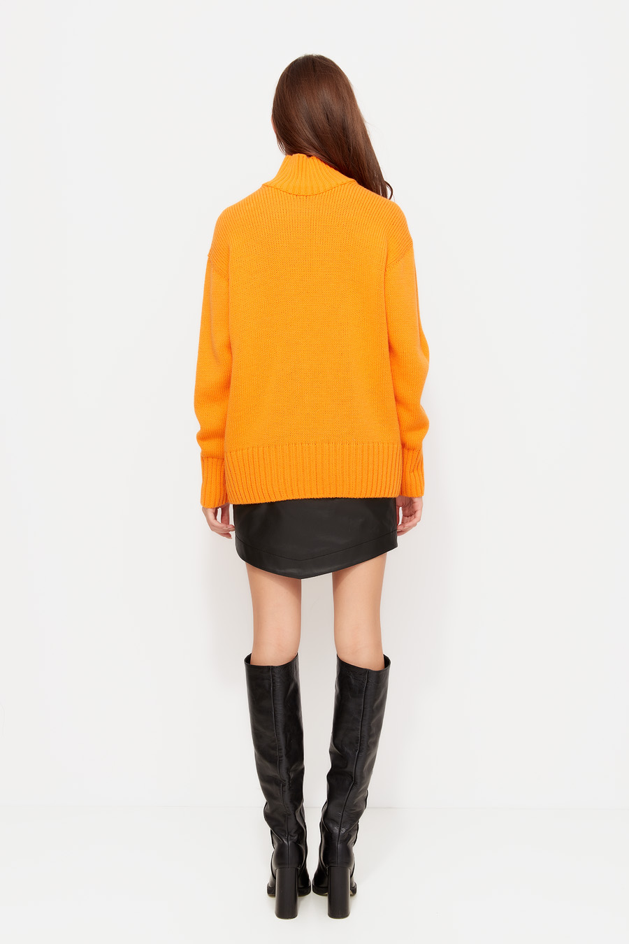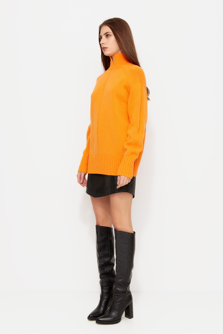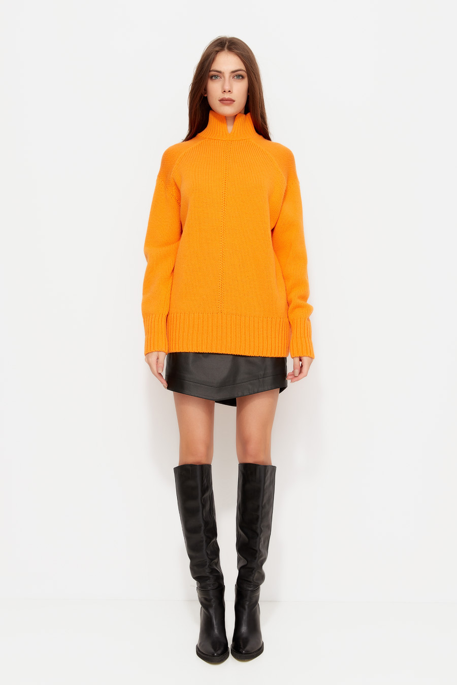 Свитер прямого кроя, длиной ниже линии бедер. Горловина высокая, с разрезом. Линия плеча спущена. Удобная вязка, приятная к телу.
