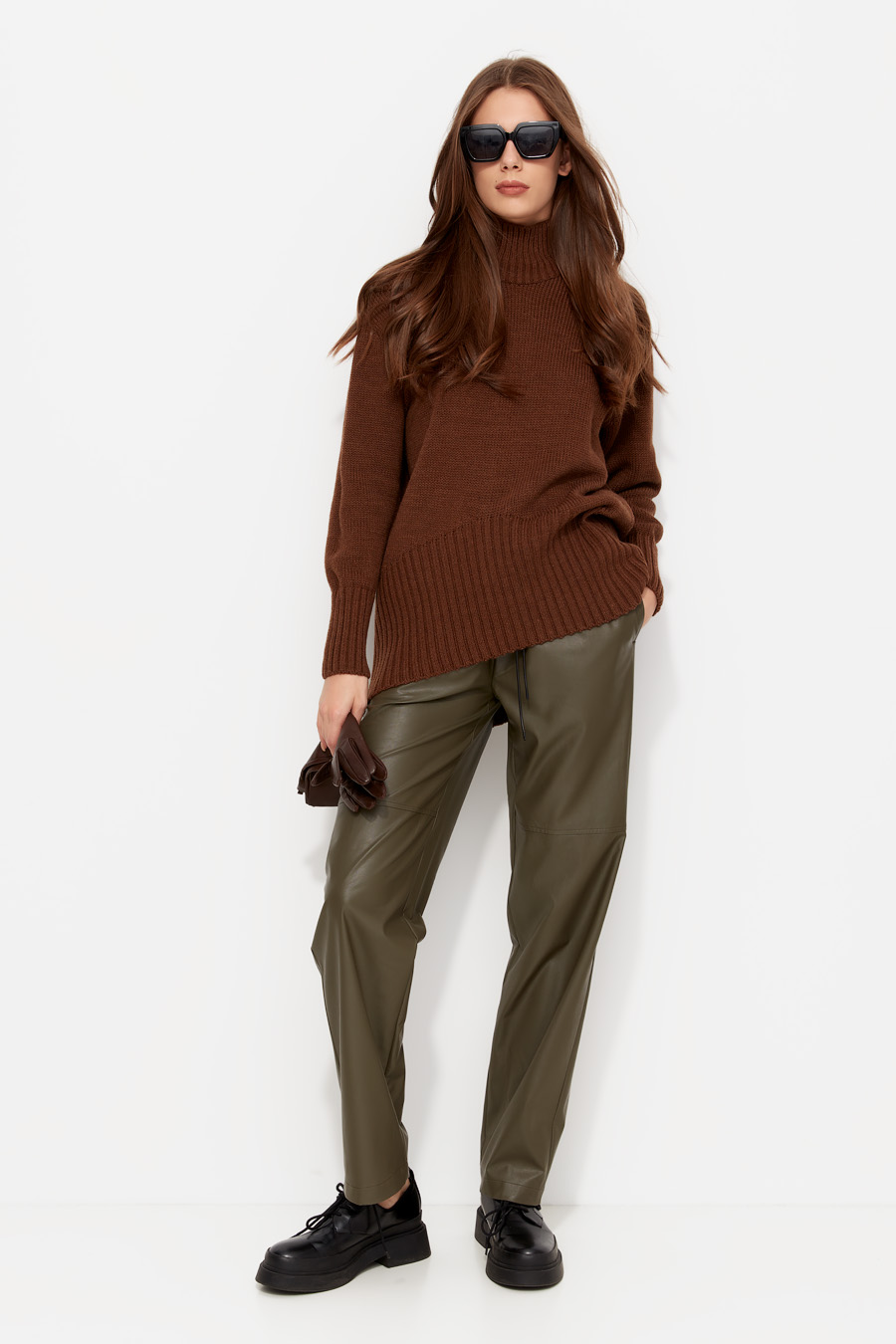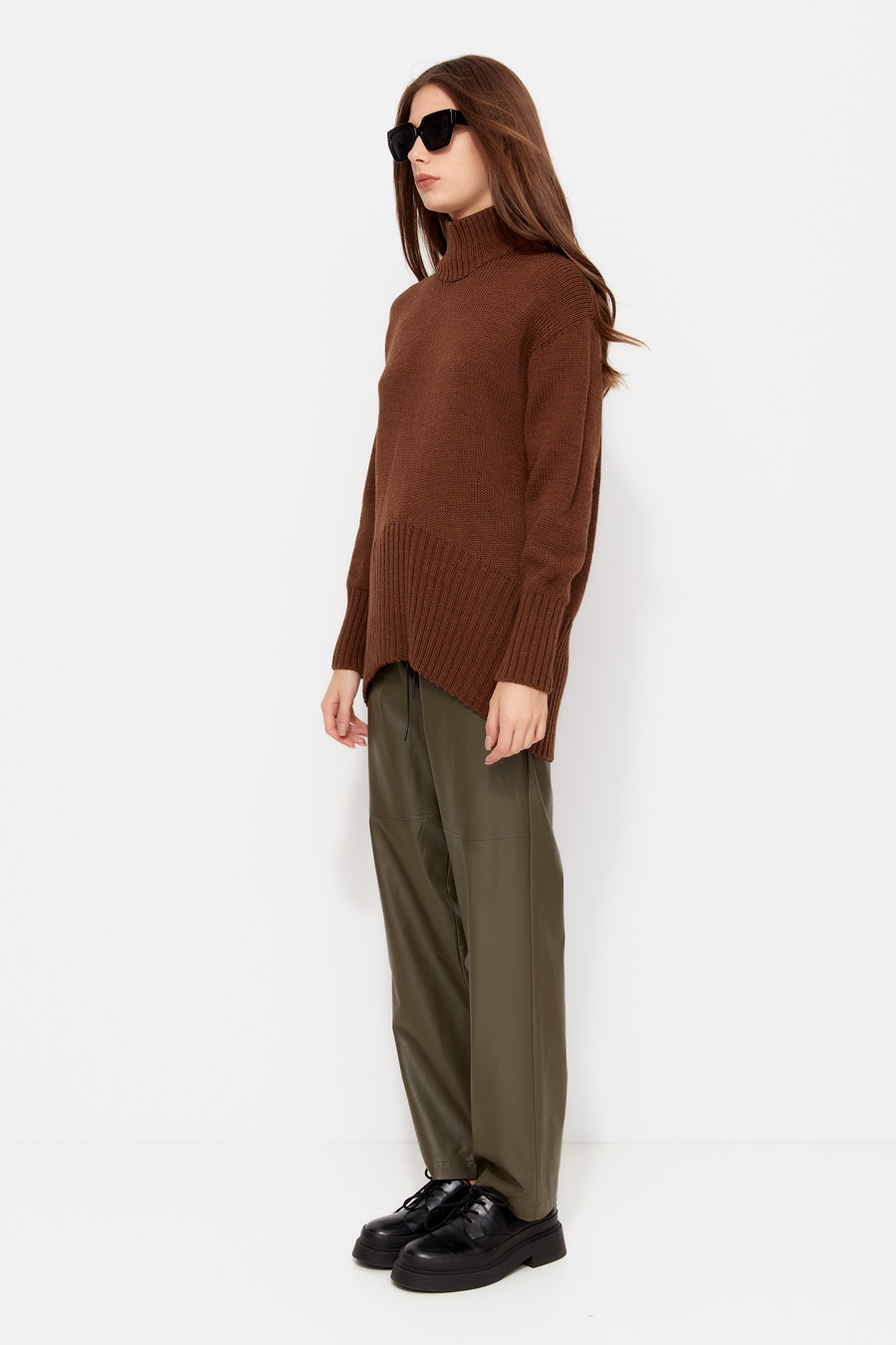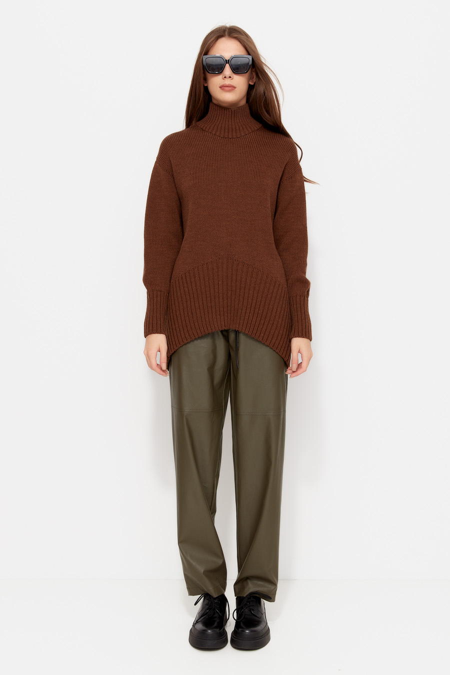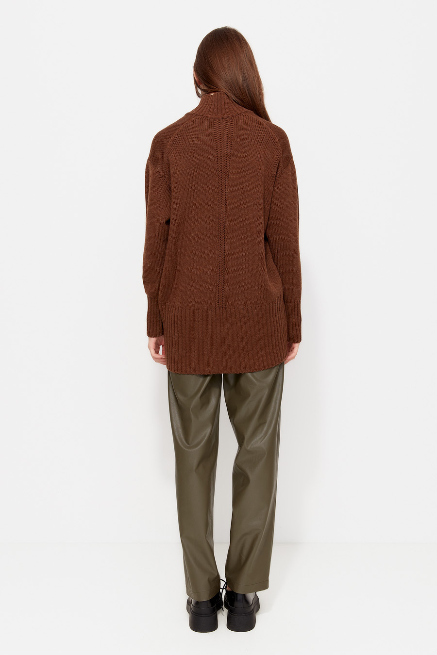 Свитер вязаный прямого кроя, асимметричной длины. Высокая горловина. Линия плеча спущена. Базовая, теплая модель для осенне-зимнего периода.