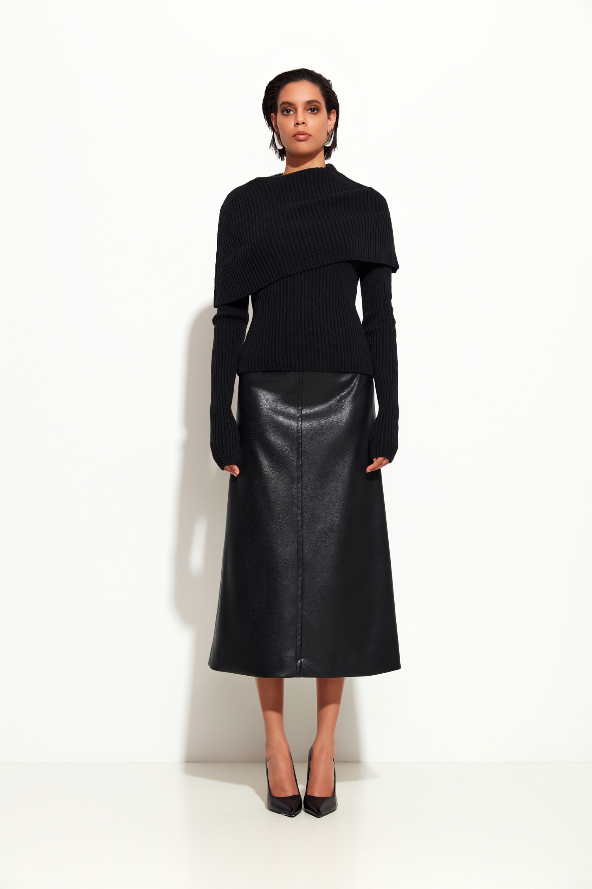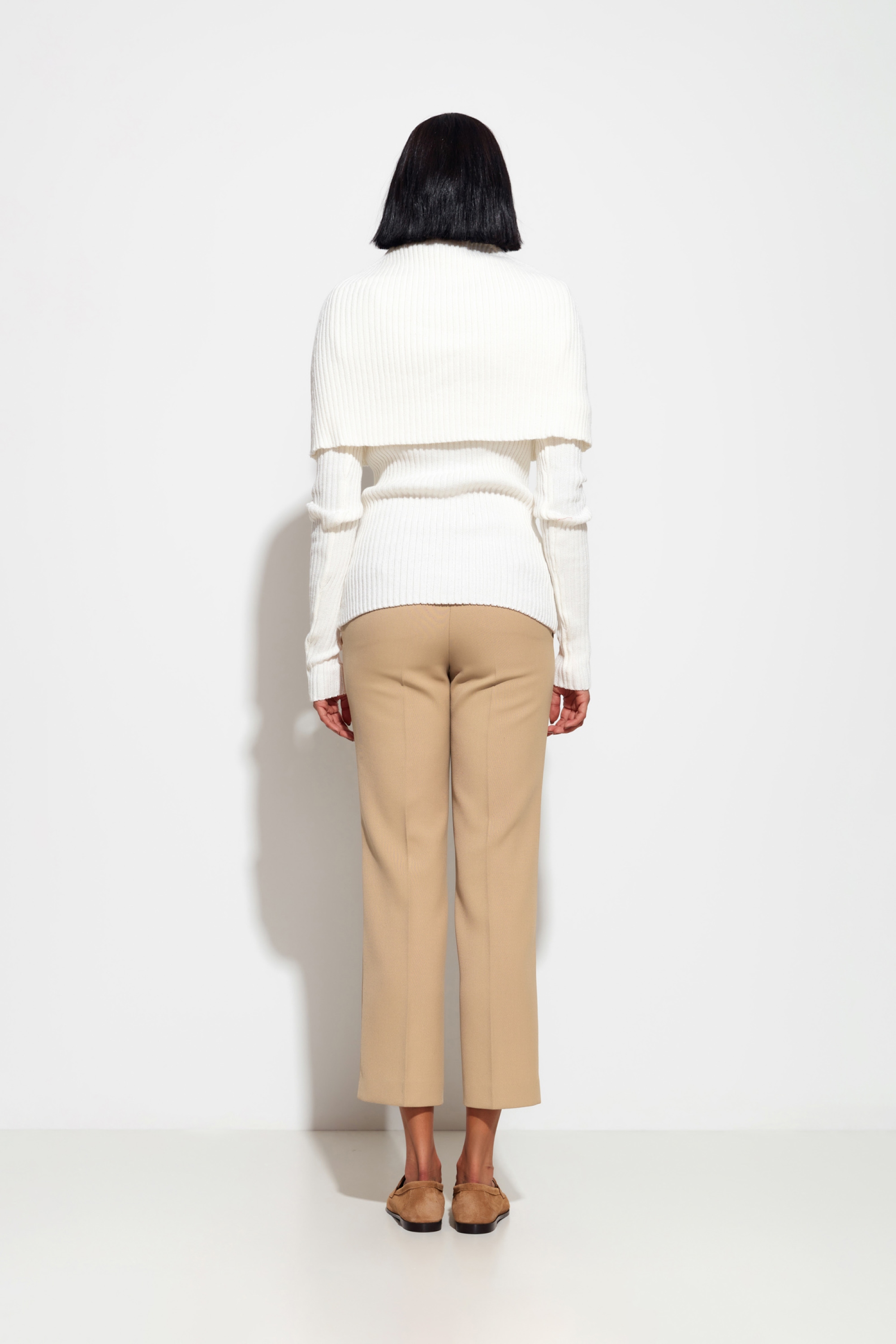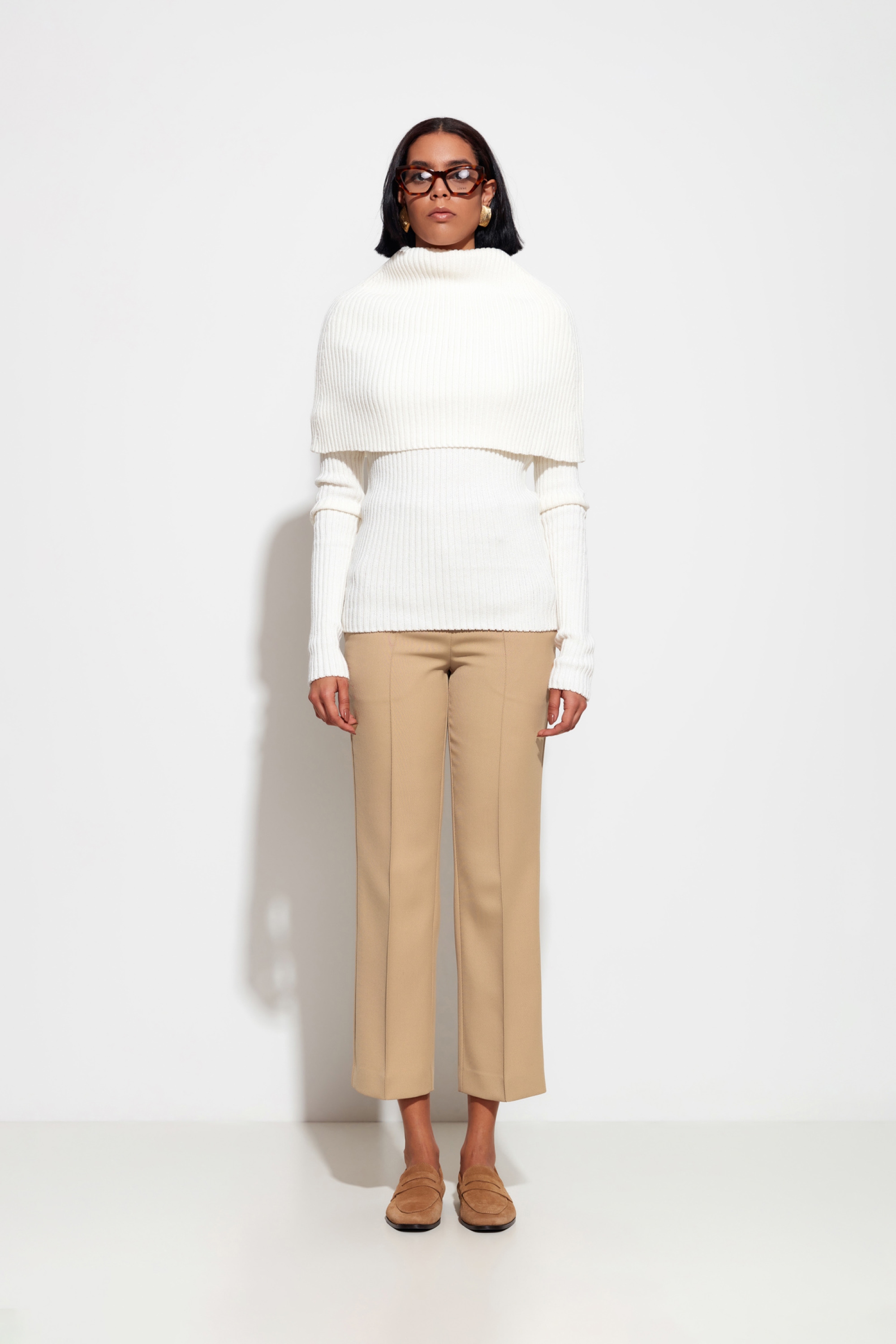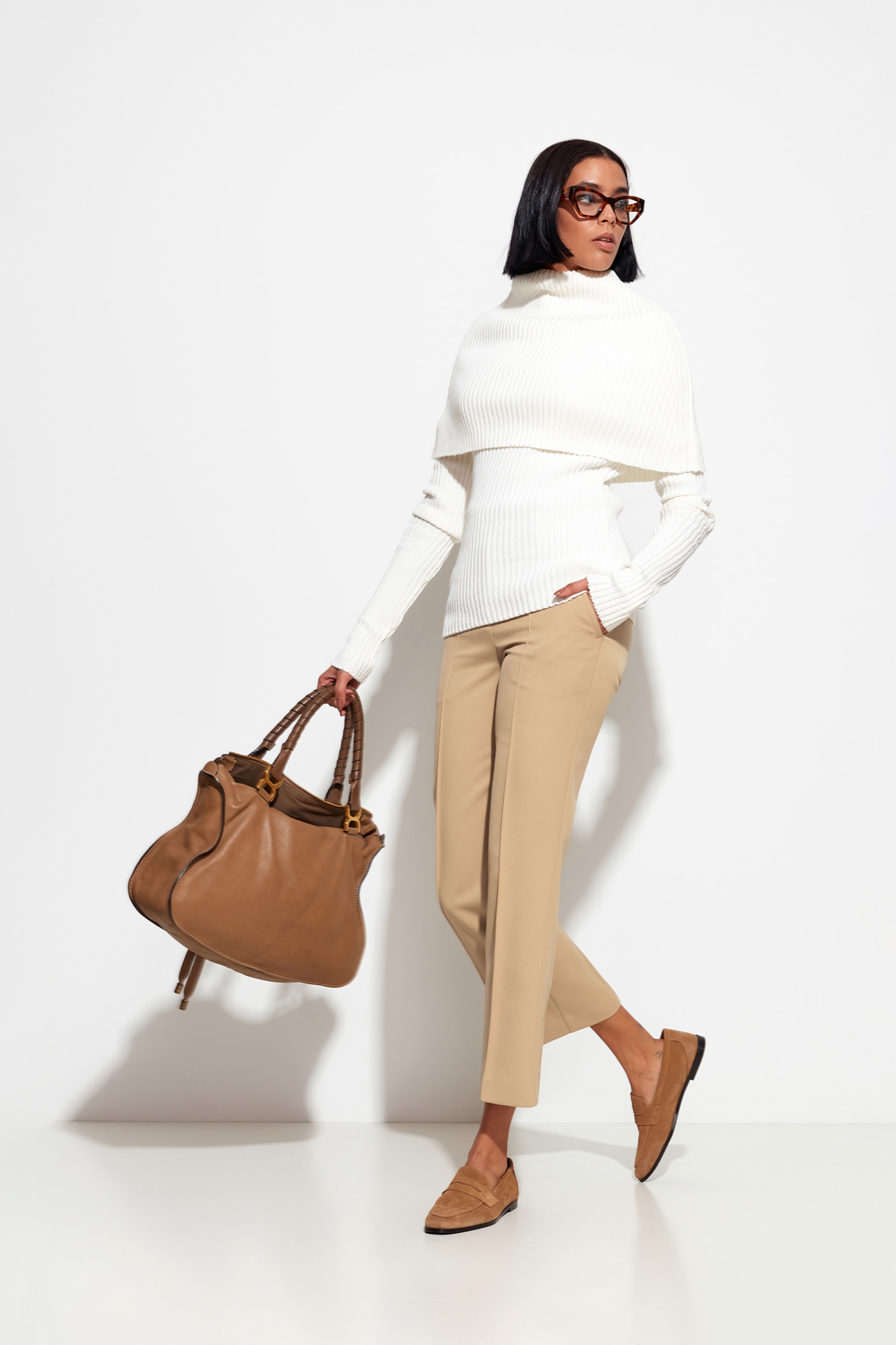 Свитер в молочном и черном цветах Lakbi из коллекции осень-зима 2025/26 — это комфортная и стильная модель, выполненная из мягкого, тёплого материала. Особое внимание уделено горловине — это широкая стойка с оригинальной драпировкой, которая не только придаёт свитеру изысканный и современный вид, но и обеспечивает дополнительное тепло и уют в прохладную погоду. Свитер имеет прилегающий силуэт, который легко сочетается с разной одеждой и подходит для многослойных образов.