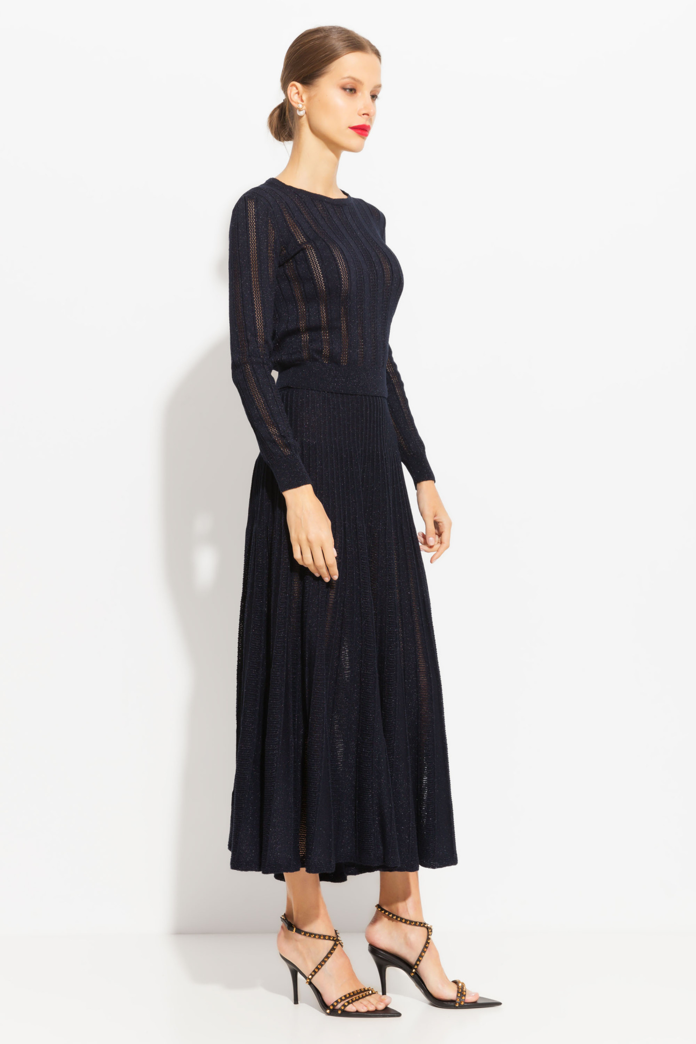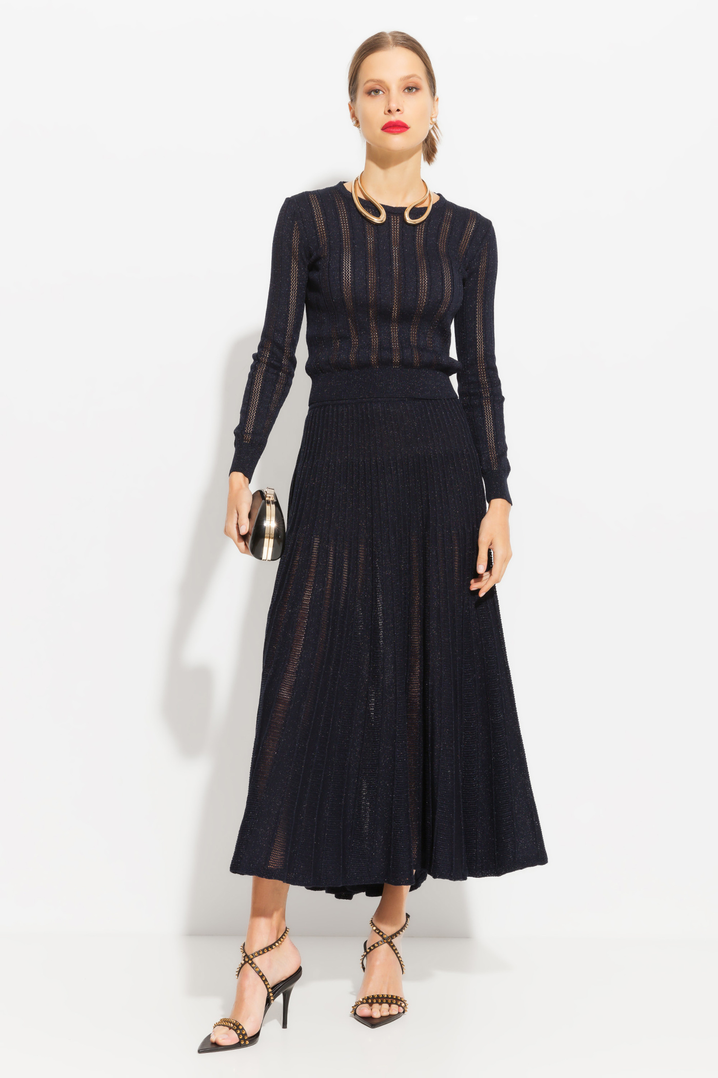 Состав: 80% вискоза, 11% полиамид, 9% металл. волокно. Юбка миди вязаная, А-образного силуэта. Пояс на эластичной резинке. Полупрозрачная пряжа делает изделие более легким и женственным, что добавит в любой образ романтичности и свежести.