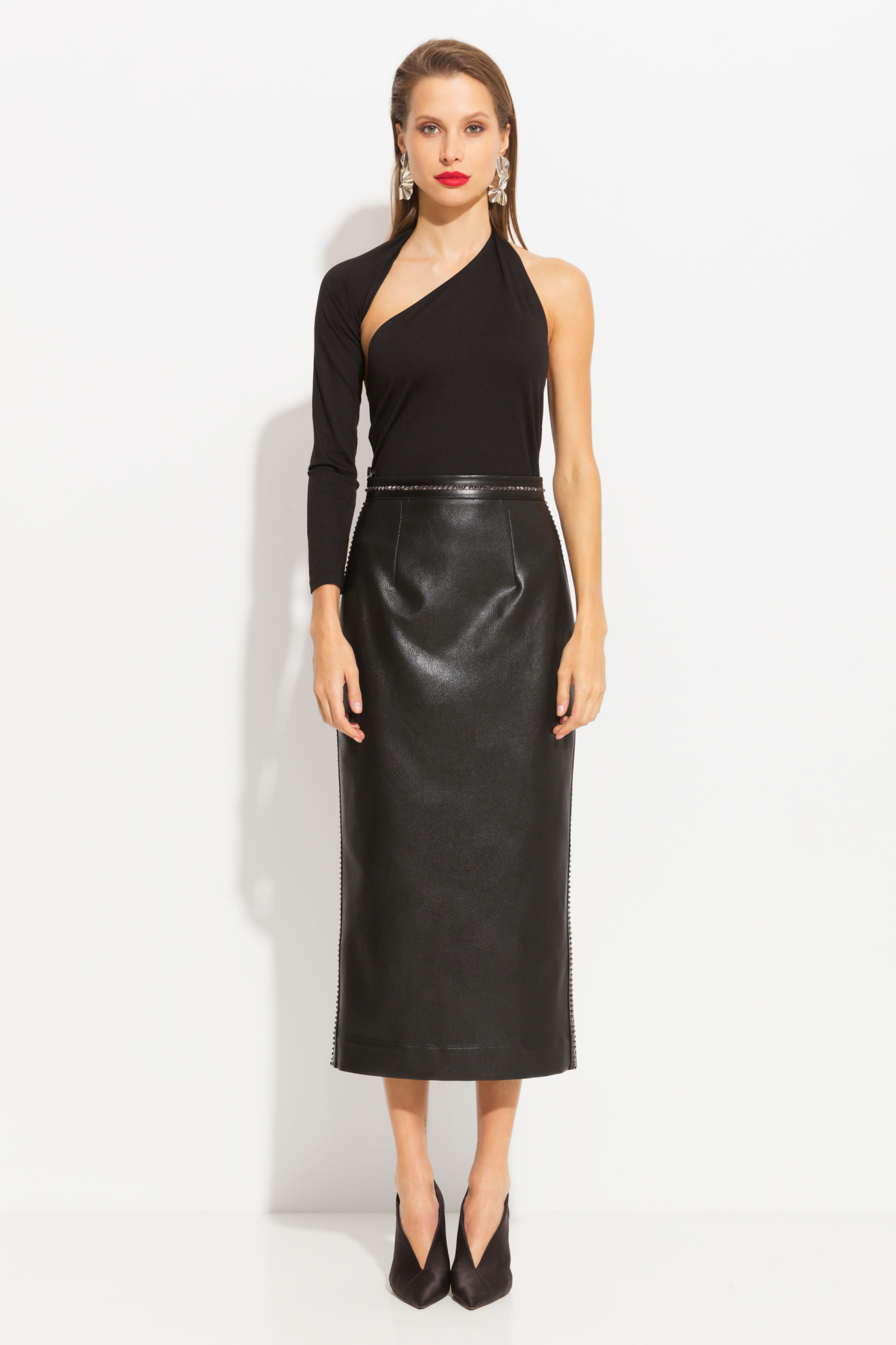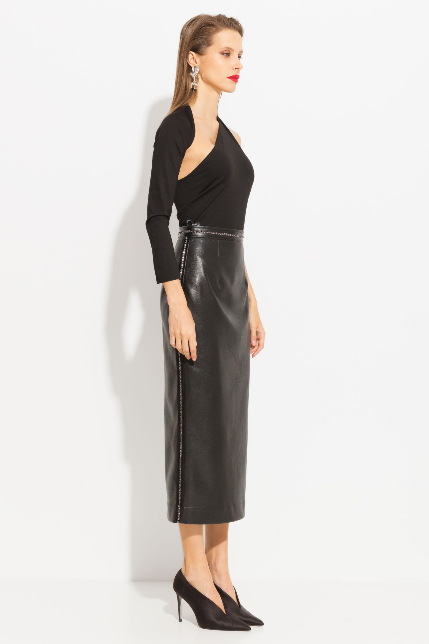 Юбка миди из эко-кожи. Посадка изделия средняя. Пояс и боковые швы декорированы металлической тесьмой. Классическая модель, которая подойдет к любому типу гардероба и будет уместна на любом мероприятии.