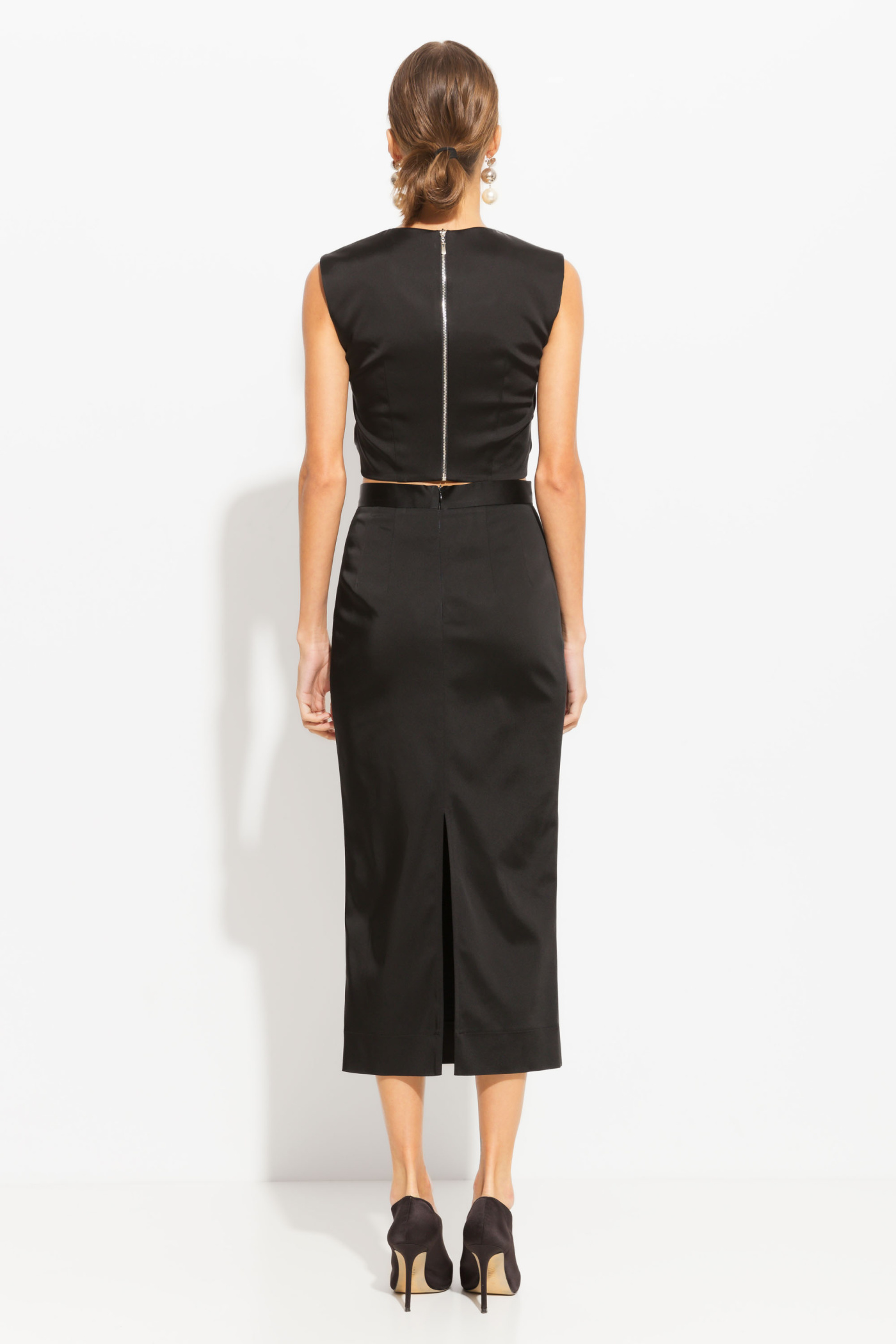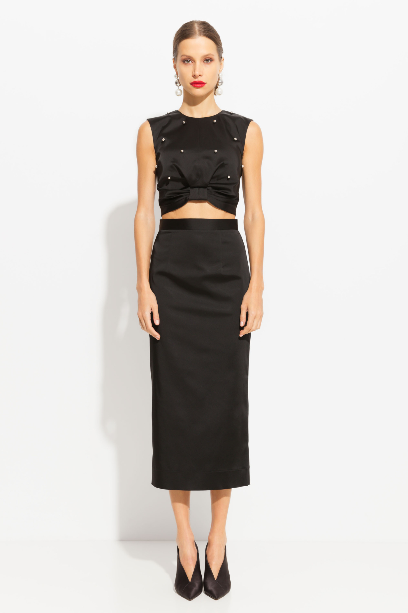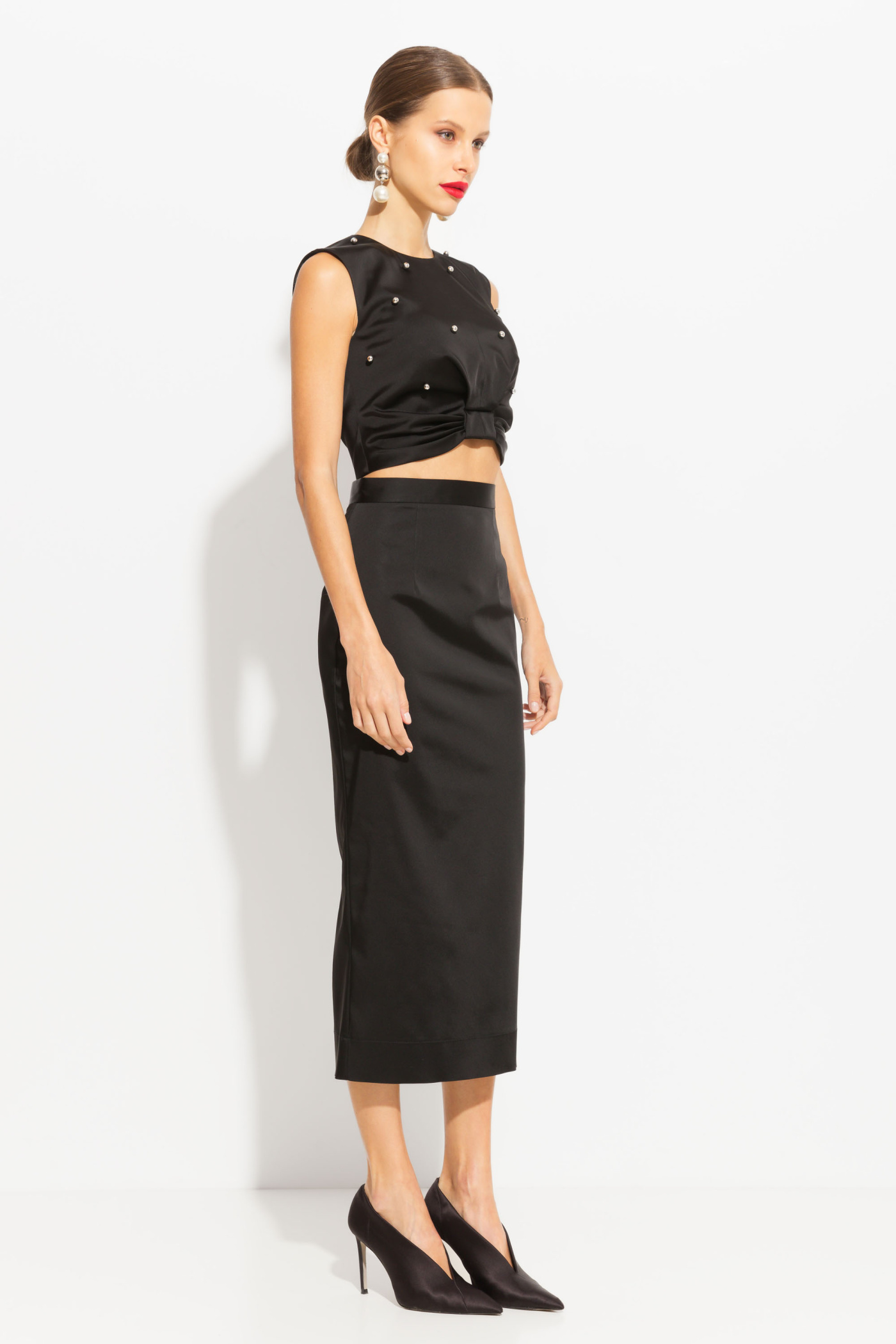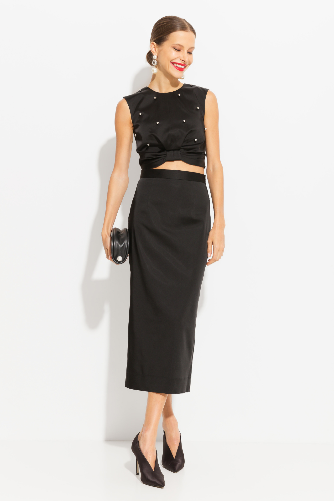 Юбка миди полуприлегающего силуэта. Посадка изделия высокая. Классическая, эффектная модель для создания эффектных образов и официальных встреч.