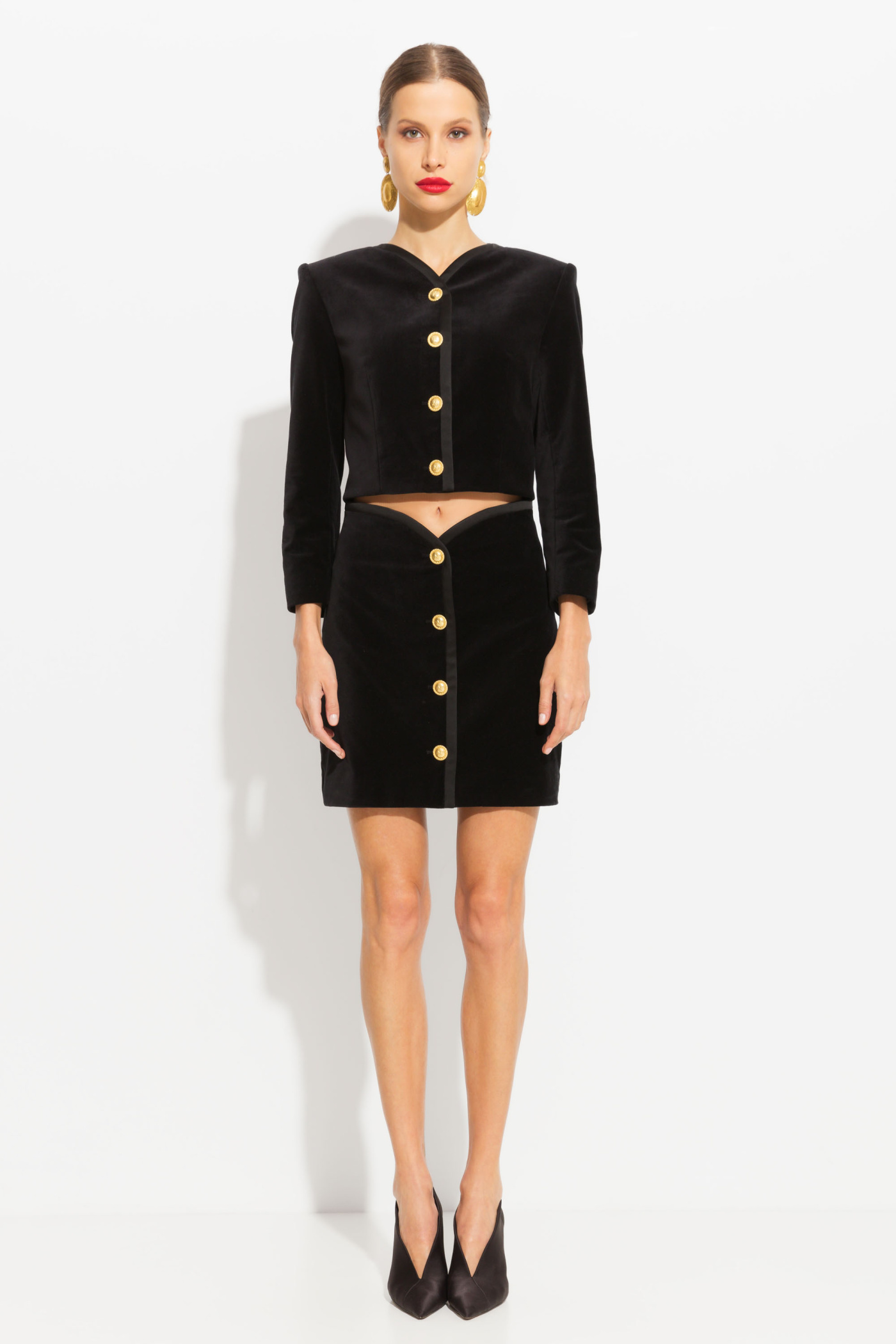 Юбка мини из бархата, полуприлегающего силуэта. Асимметричный верх. Посадка изделия средняя. Застегивается на акцентные пуговицы контрастного цвета. Эффектная модель, которая сделает любой образ незаурядным.