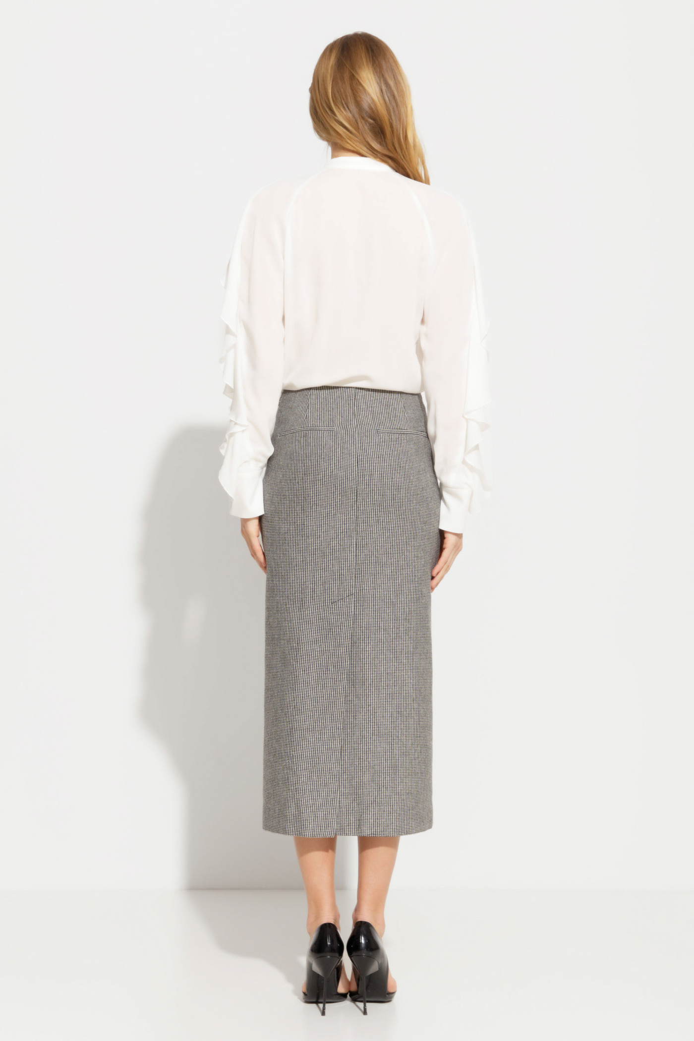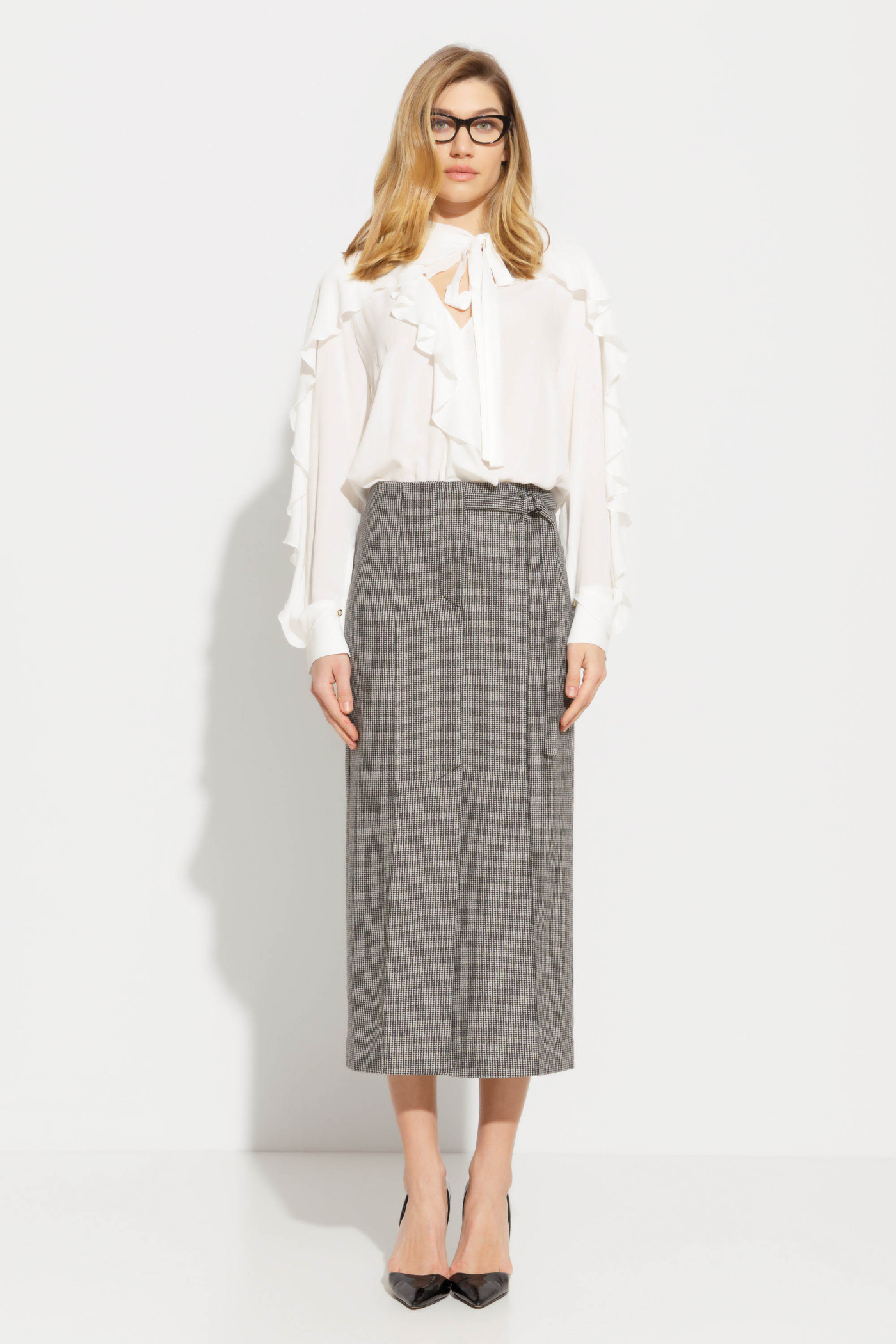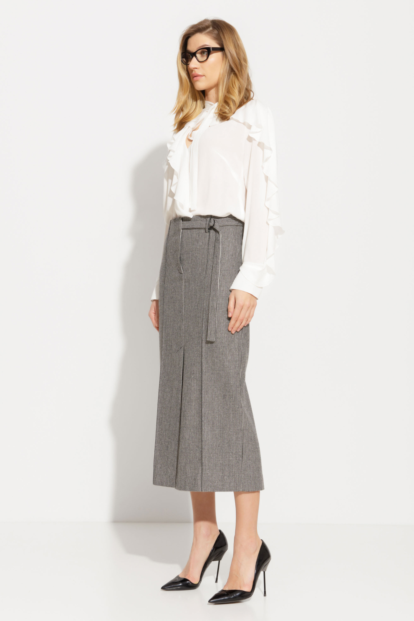 Юбка полуприлегающего силуэта, длиной ниже колена создает элегантный образ, подчеркивающий женственность и изящество. Застежка на талии придают юбке особую изюминку, а цельнокроеный пояс обеспечивает идеальную посадку на талии. Красиво обработанный низ и шлицы, выполненные однониточным цепным стежком, придают юбке дополнительную изящность и утонченность. Внутренняя подкладка обеспечивает комфорт при ношении и делает эту юбку идеальной для любого случая - от деловых встреч до романтических свиданий. Это настоящая находка для женщин, которые ценят красоту и функциональность в одном изделии.