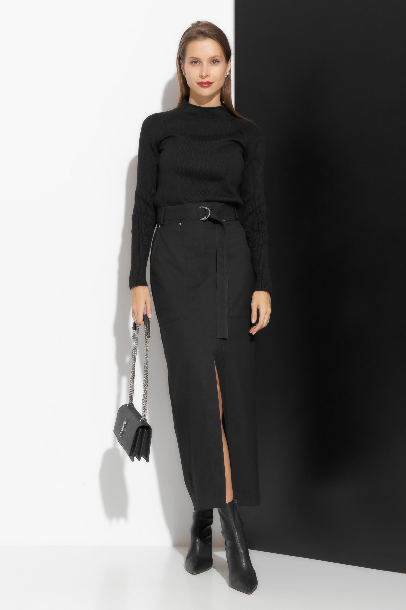 Юбка миди полуприлегающего силуэта. Посадка изделия высокая. Спереди два накладных кармана. На талии пояс из аналогичной ткани, который подчеркивает линию талии. Эффектный разрез визуально удлиняет ноги. Стильная, универсальная модель для создания ежедневных аутфитов. Сочетается как с обувью на каблуках, так и на низкой платформе.