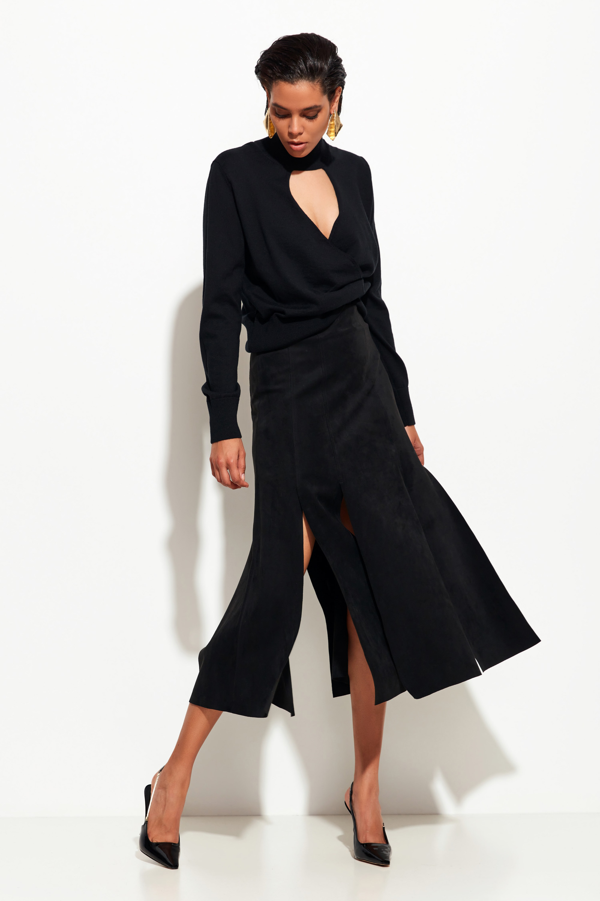 Юбка Lakbi 55149 — стильная расклешённая модель длины миди с эффектным разрезом.