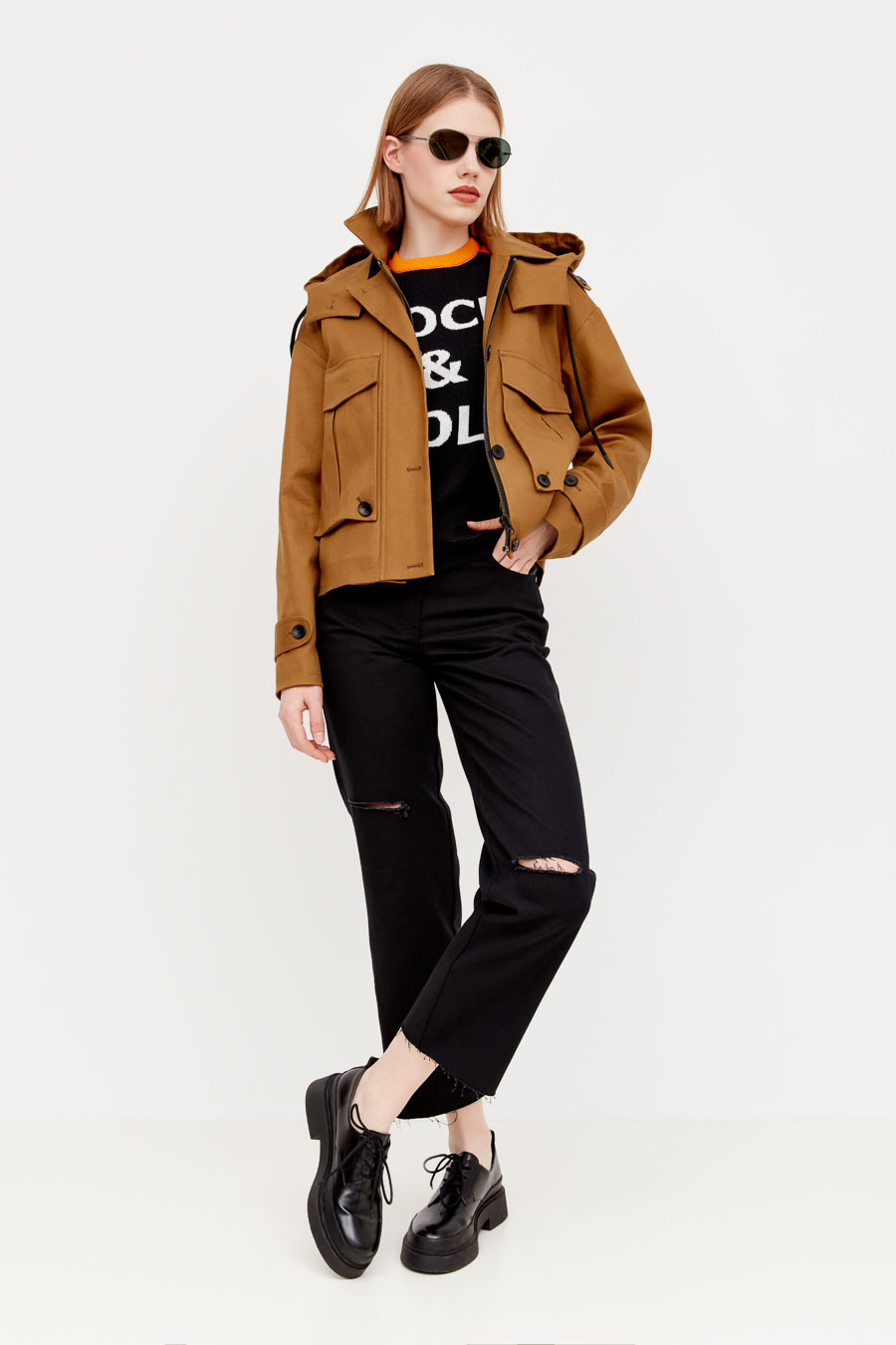 Жакет прямого кроя, с капюшоном, длинной выше линии бедер. Спереди два накладных кармана с клапанами. Плечи декорированы эполетами (погонами). Отличная альтернатива плащам и ветровкам.