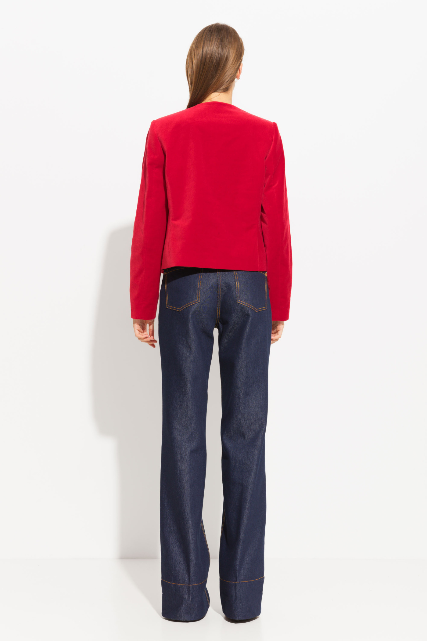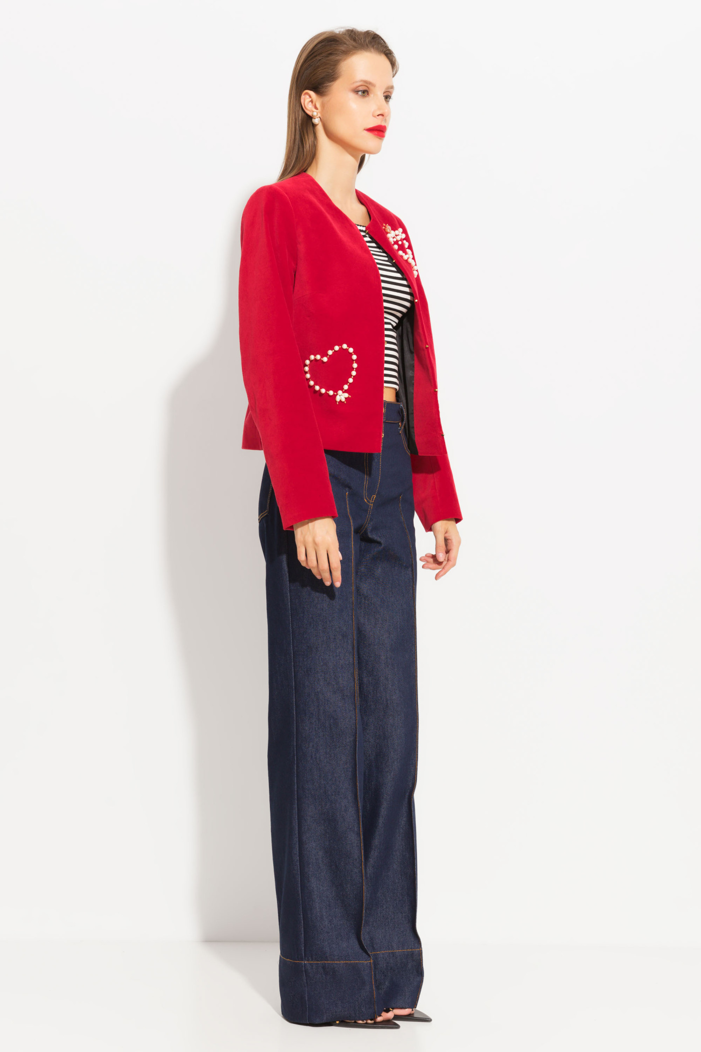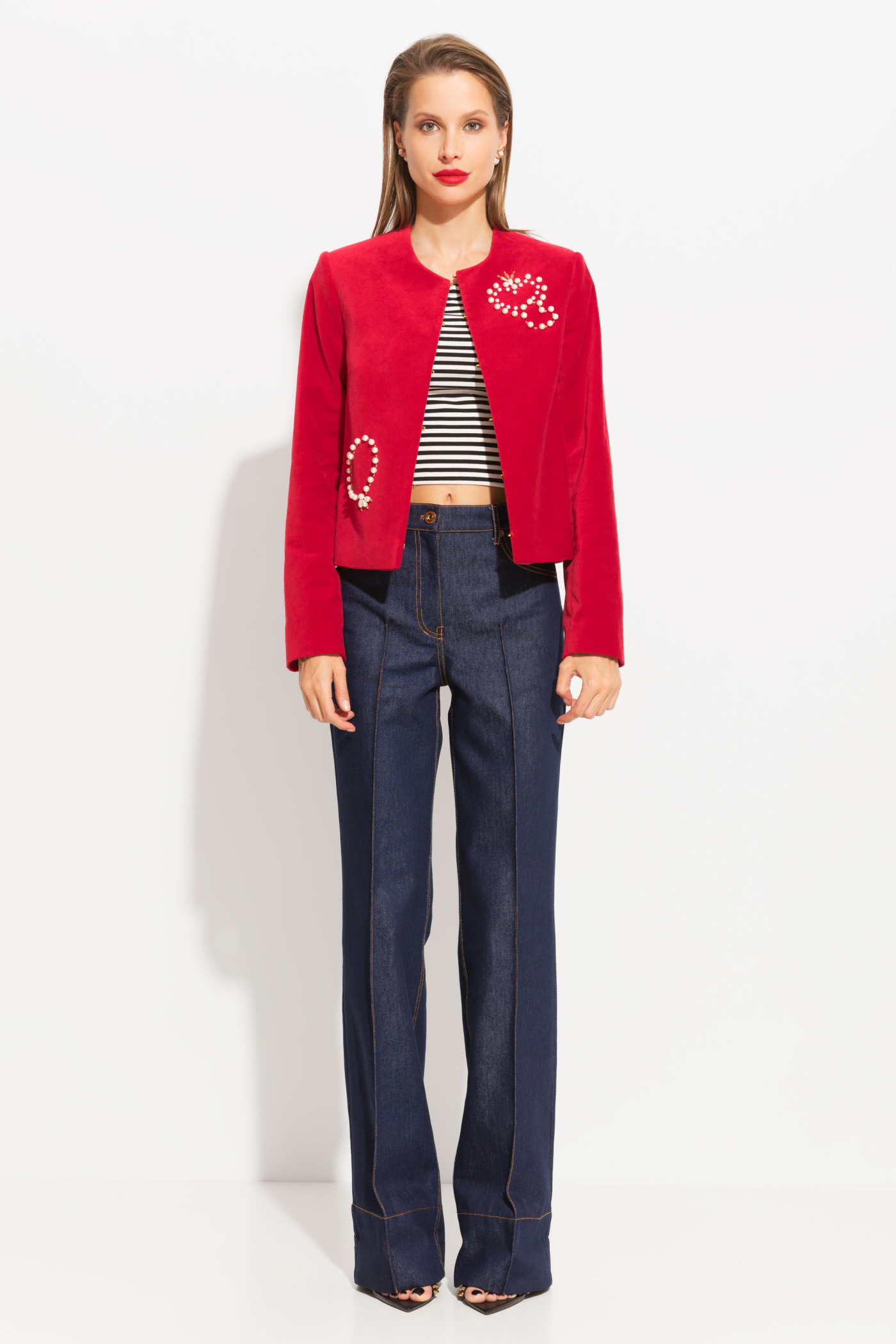 Жакет из бархата полуприлегающего силуэта, длиной выше линии бедер. Круглый вырез горловины. Перед изделия декорирован вышивкой из жемчужных бусин. Изделие застегивается на потайные петли с крючками. Стильная модель, которая подойдет к любому типу гардероба.
