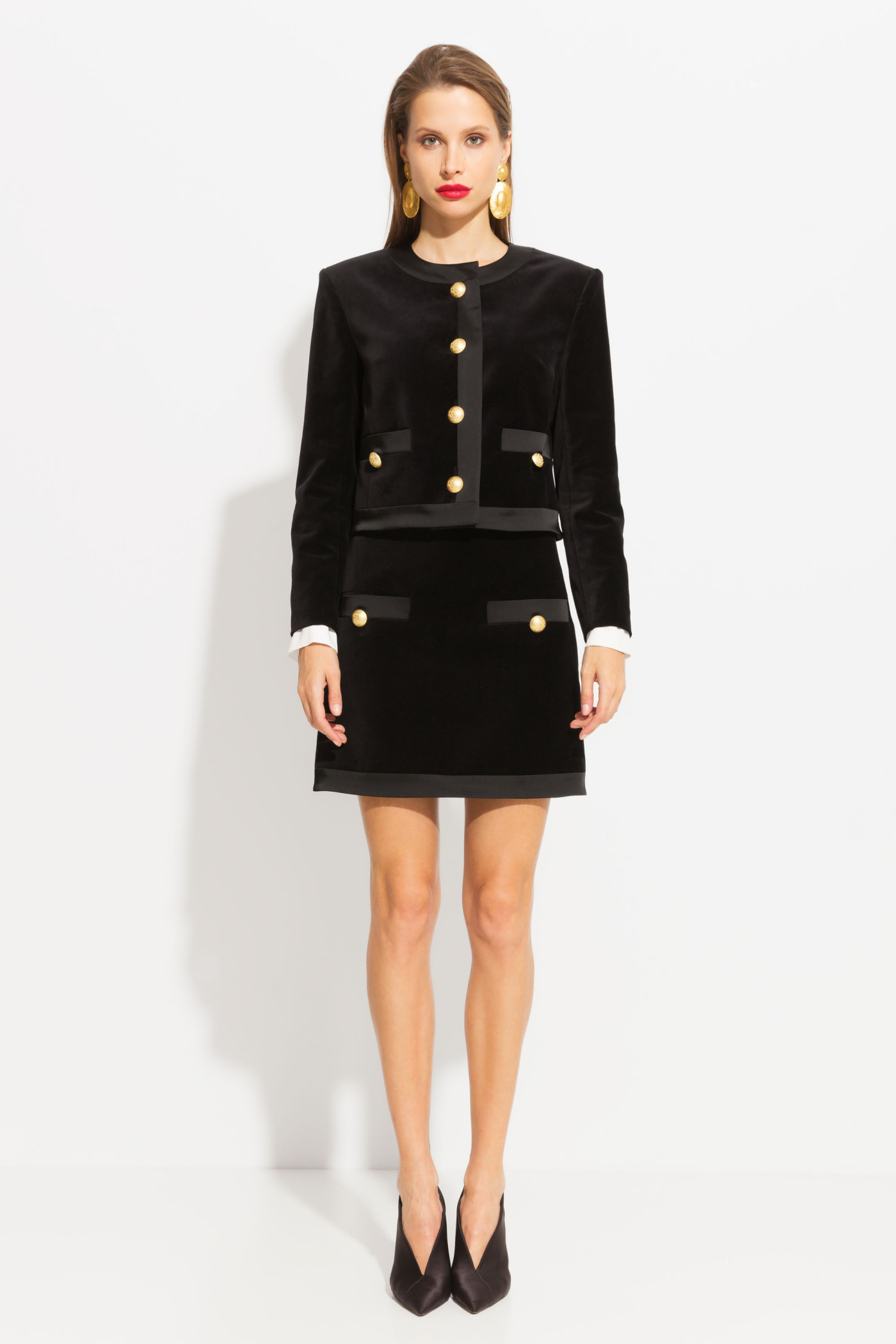 Жакет из бархата прямого кроя, длиной выше линии бедер. Круглый вырез горловины. Края изделия декорированы тесьмой. Застегивается на акцентные пуговицы. Эффектная модель для создания стильных классических образов.