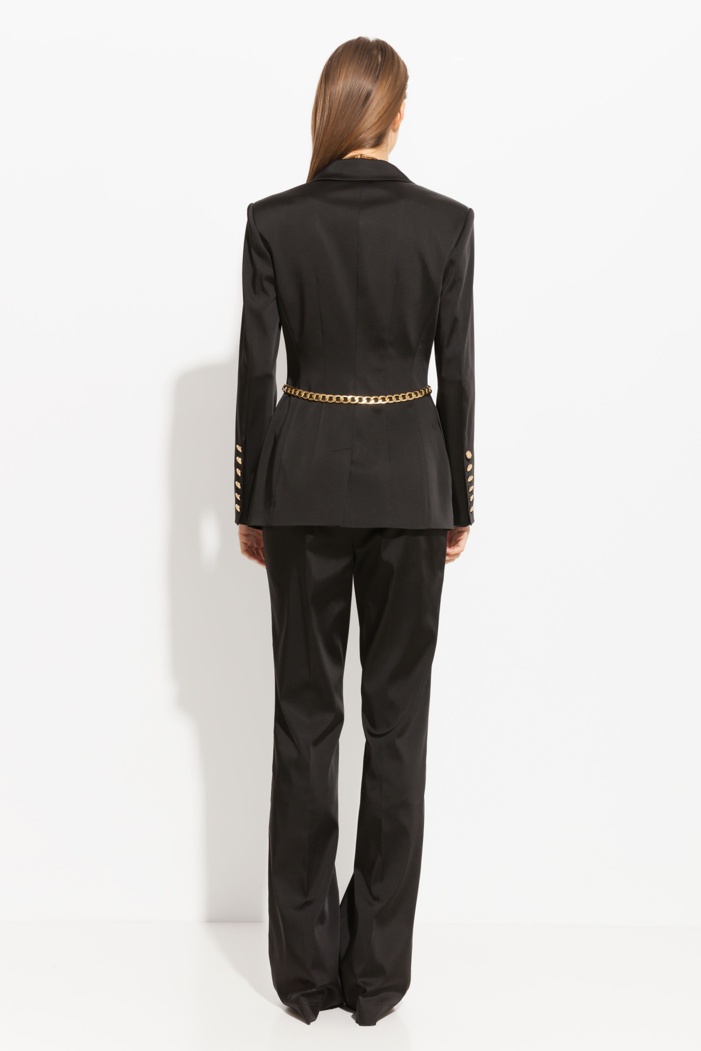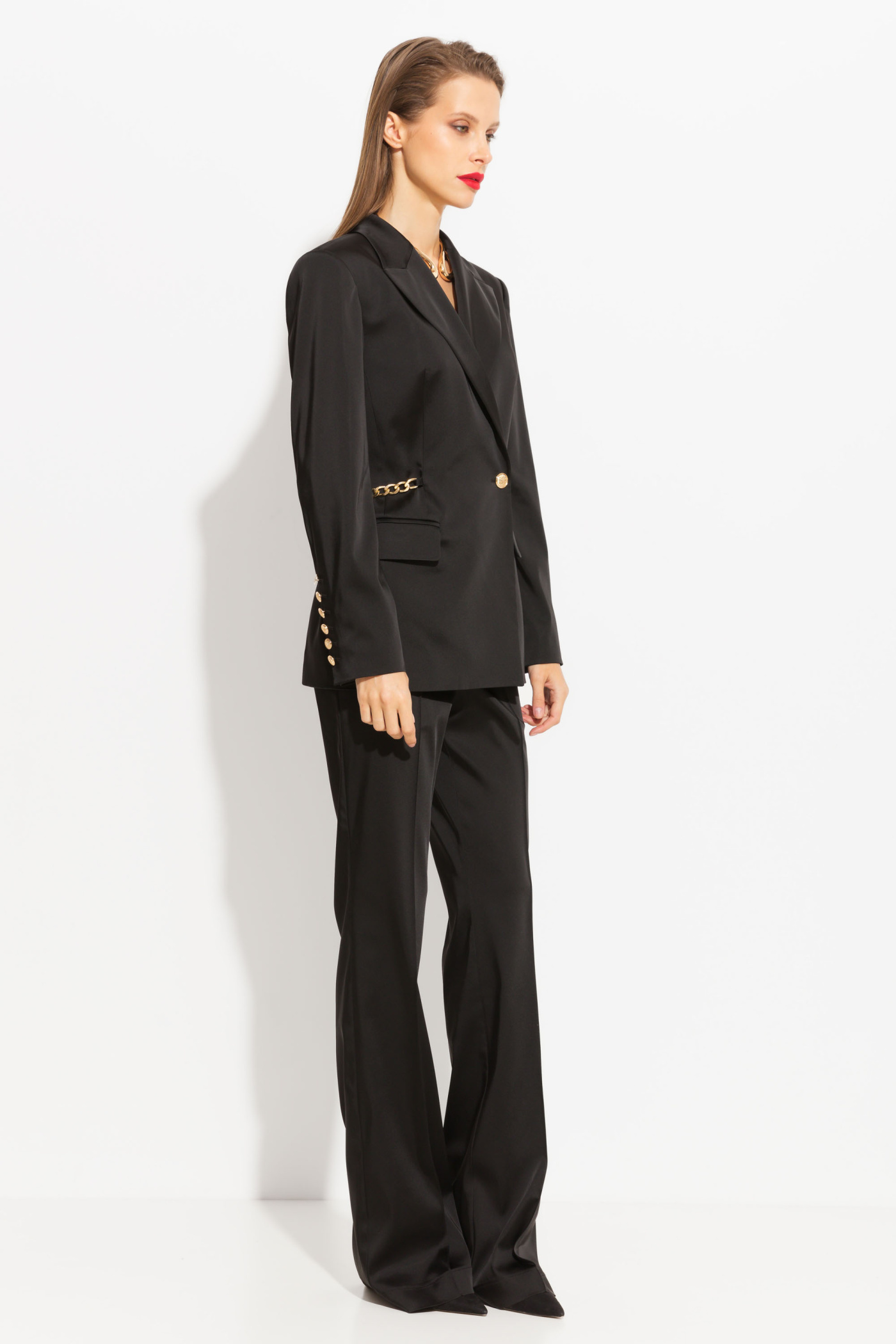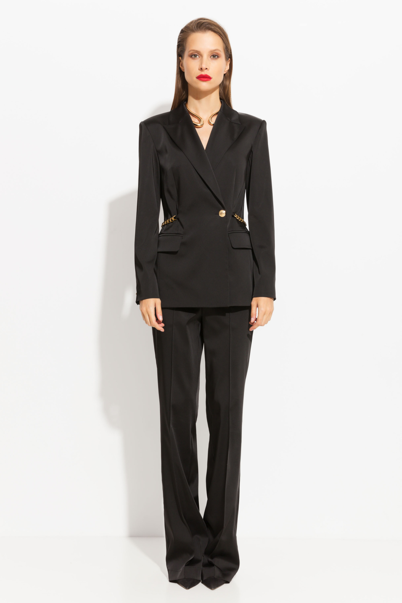 Жакет полуприлегающего силуэта, длиной до середины линии бедер. Воротник отложной. На талии декор в виде металлической цепочки. По бокам прорезные карманы с клапанами. Жакет на подкладке, с плечевыми накладками. Классическая модель, которая подойдет к любому типу гардероба. За счет блеска ткани придаст любому образу праздничности и нарядности.