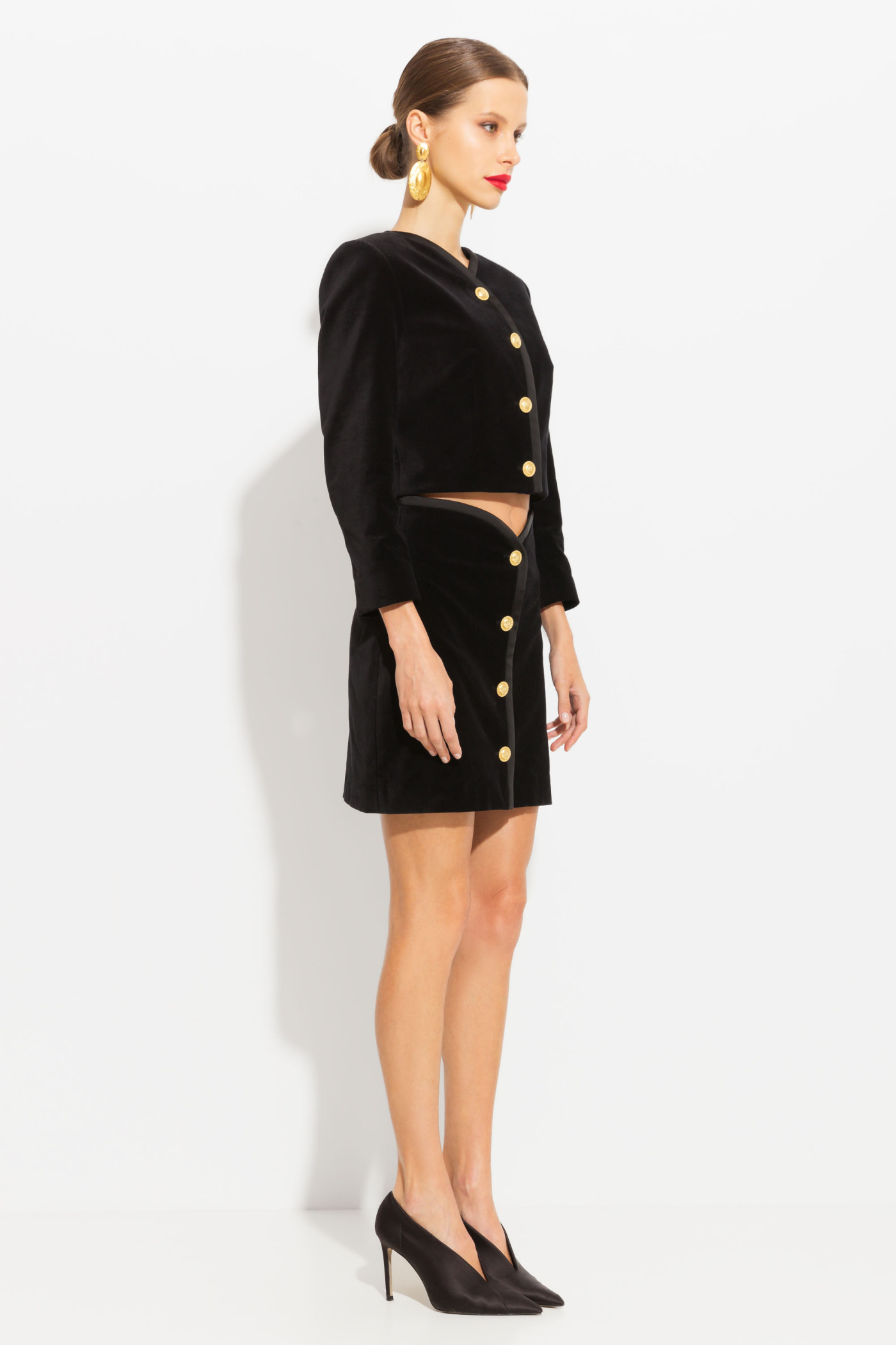 Жакет из бархата полуприлегающего силуэта, укороченной длины. V-образный вырез горловины. Края изделия декорированы тесьмой. Застегивается на акцентные пуговицы контрастного цвета. Эффектная модель, которая любой образ сделает эффектным и незаурядным.