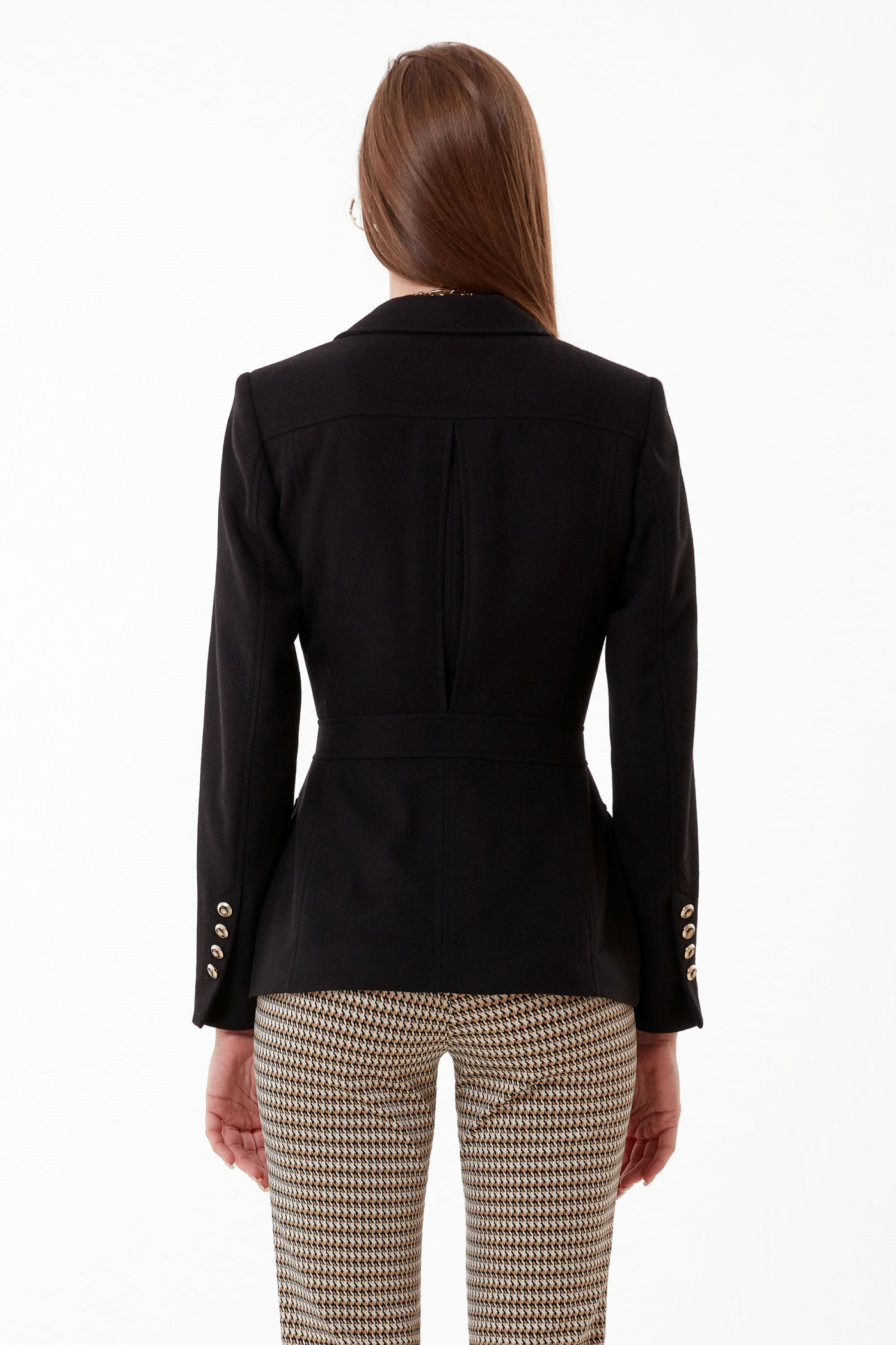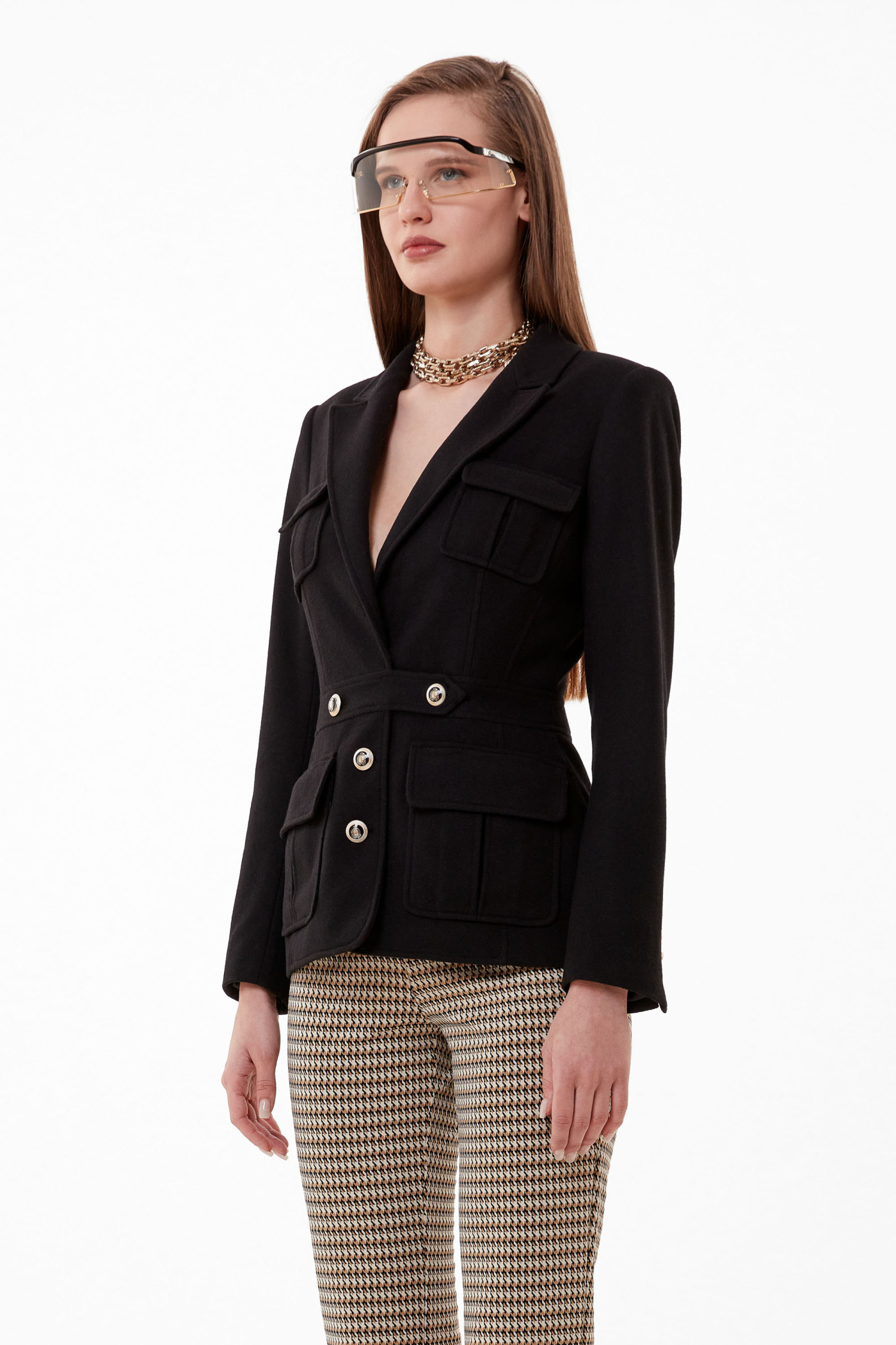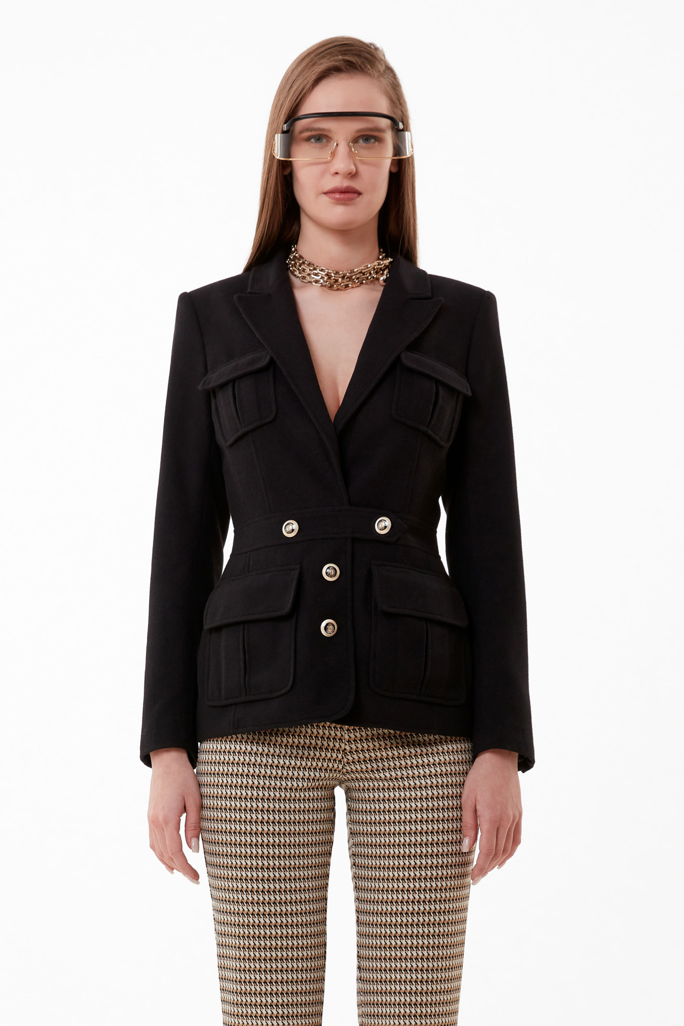 Жакет шерстяной прилегающего силуэта, укороченной длины. V-образный вырез горловины. Воротник отложной. Спереди накладные карманы с клапанами. Жакет на подкладке, с плечевыми накладками.