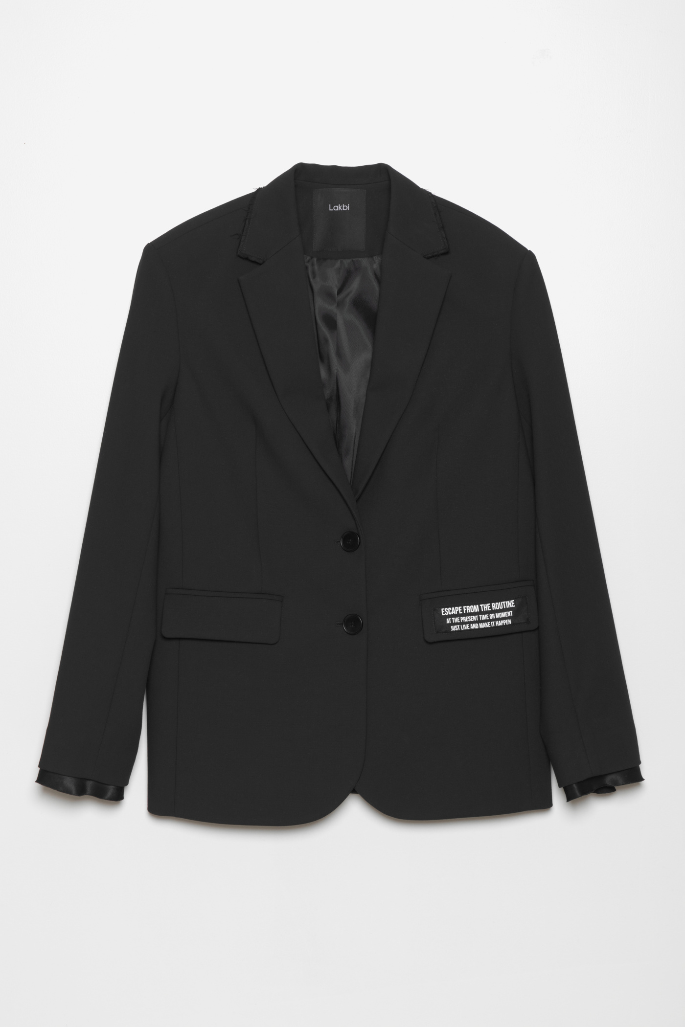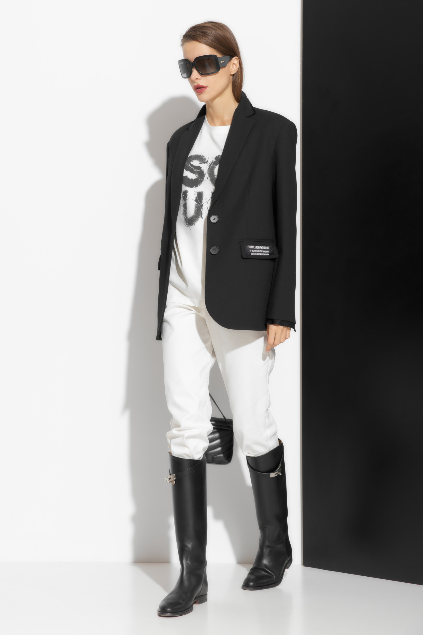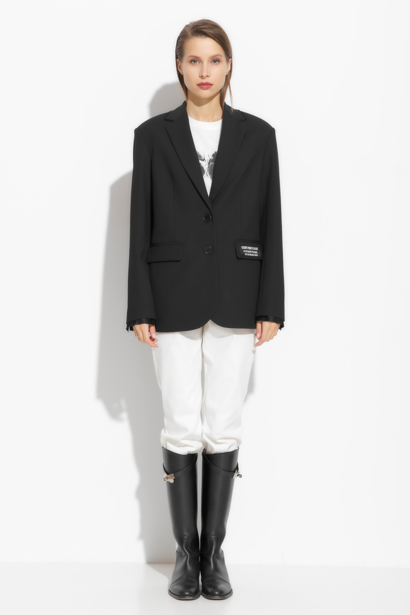 Жакет прямого кроя, длиной ниже линии бедер. Воротник отложной. Левый кармана декорирован нашивкой контрастного цвета. Универсальный крой и цвет позволяют сочетать жакет с различными стилями одежды. Жакет на подкладке, с плечевыми накладками.
