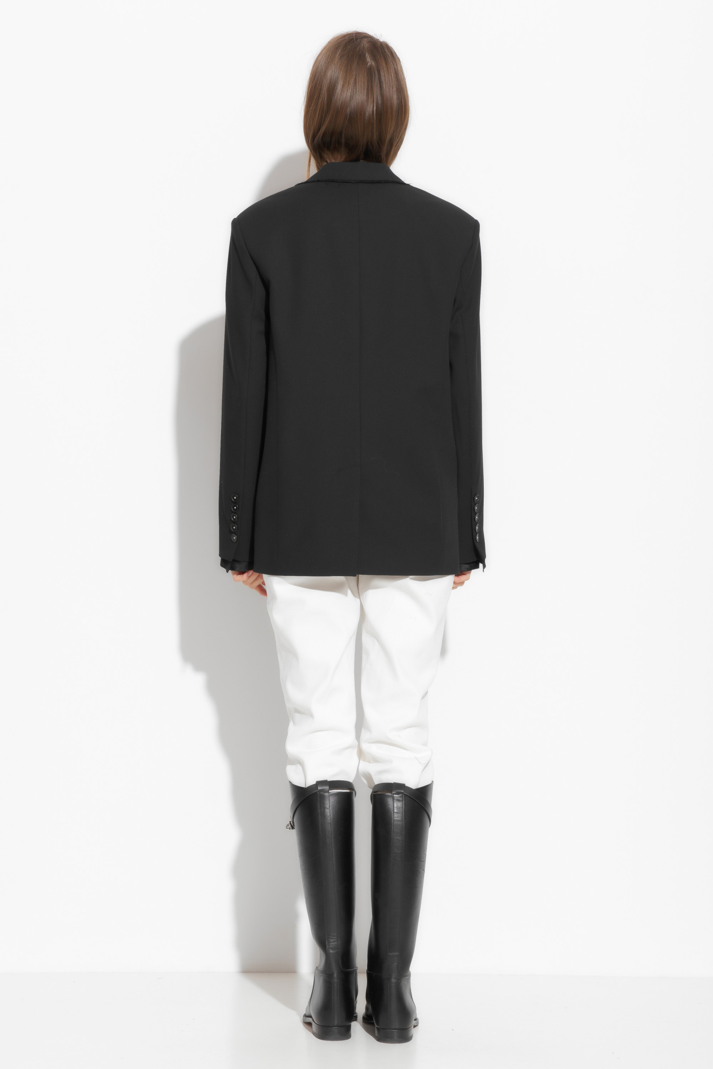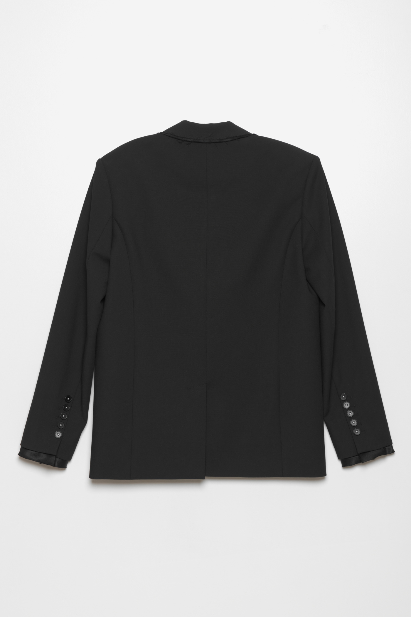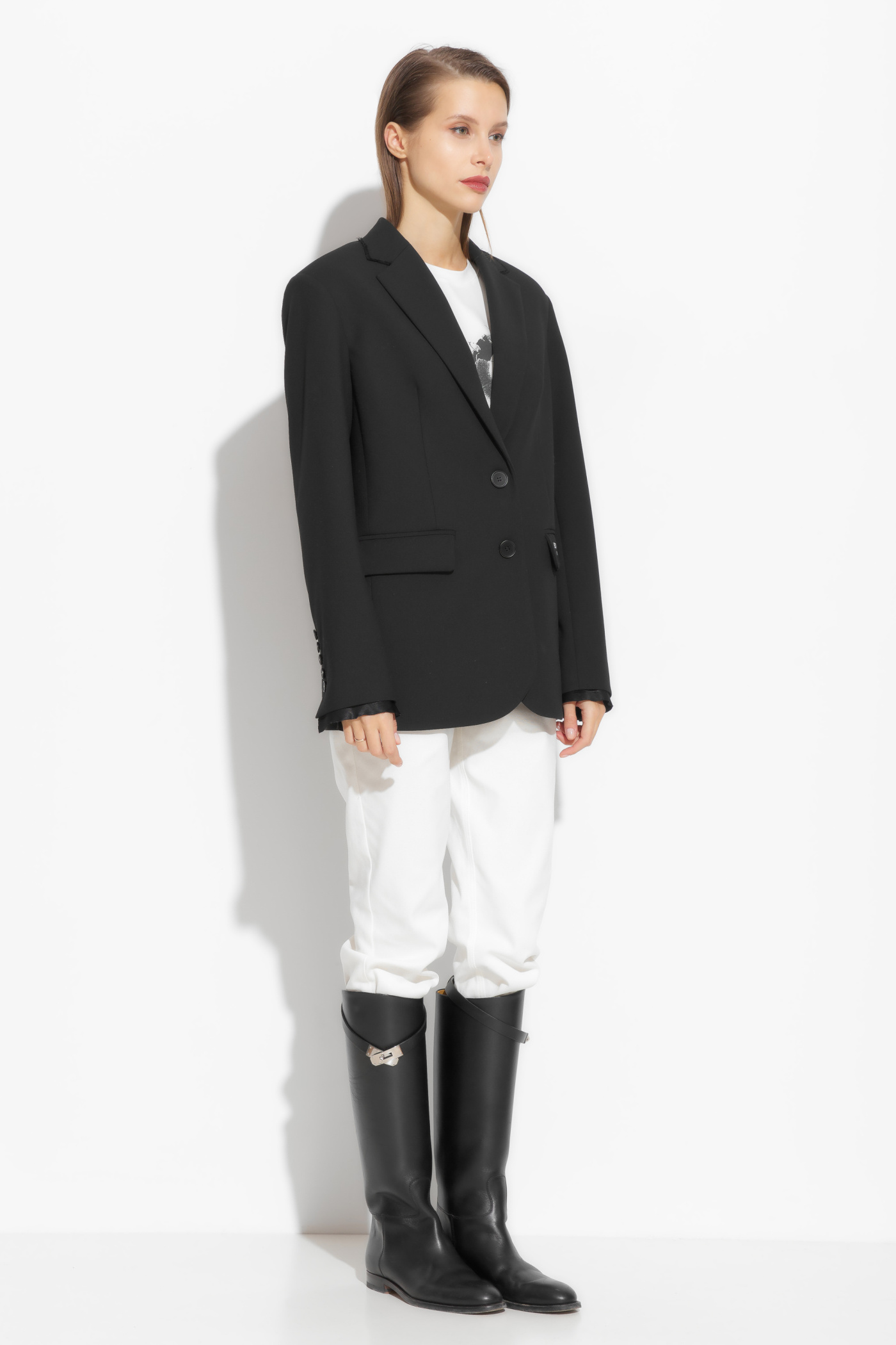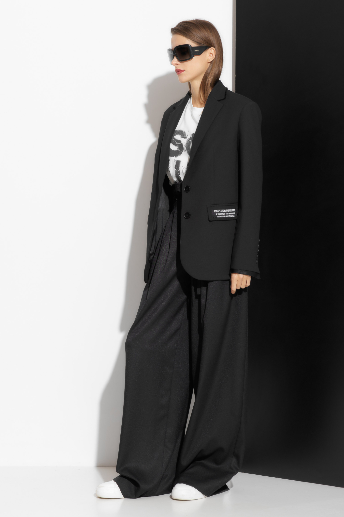 Жакет прямого кроя, длиной ниже линии бедер. Воротник отложной. Левый кармана декорирован нашивкой контрастного цвета. Универсальный крой и цвет позволяют сочетать жакет с различными стилями одежды. Жакет на подкладке, с плечевыми накладками.