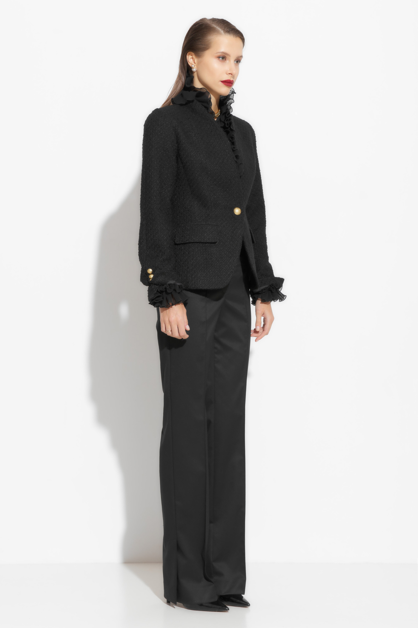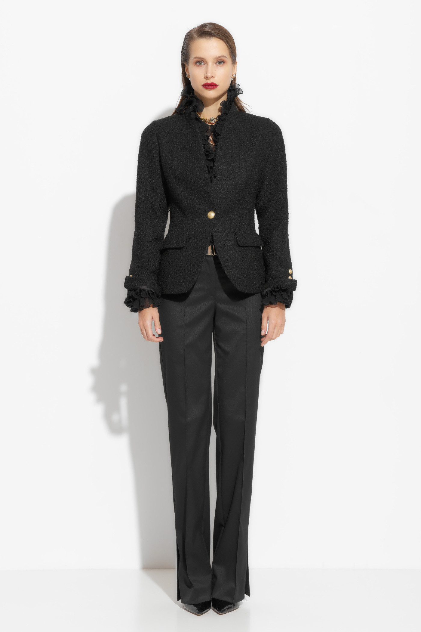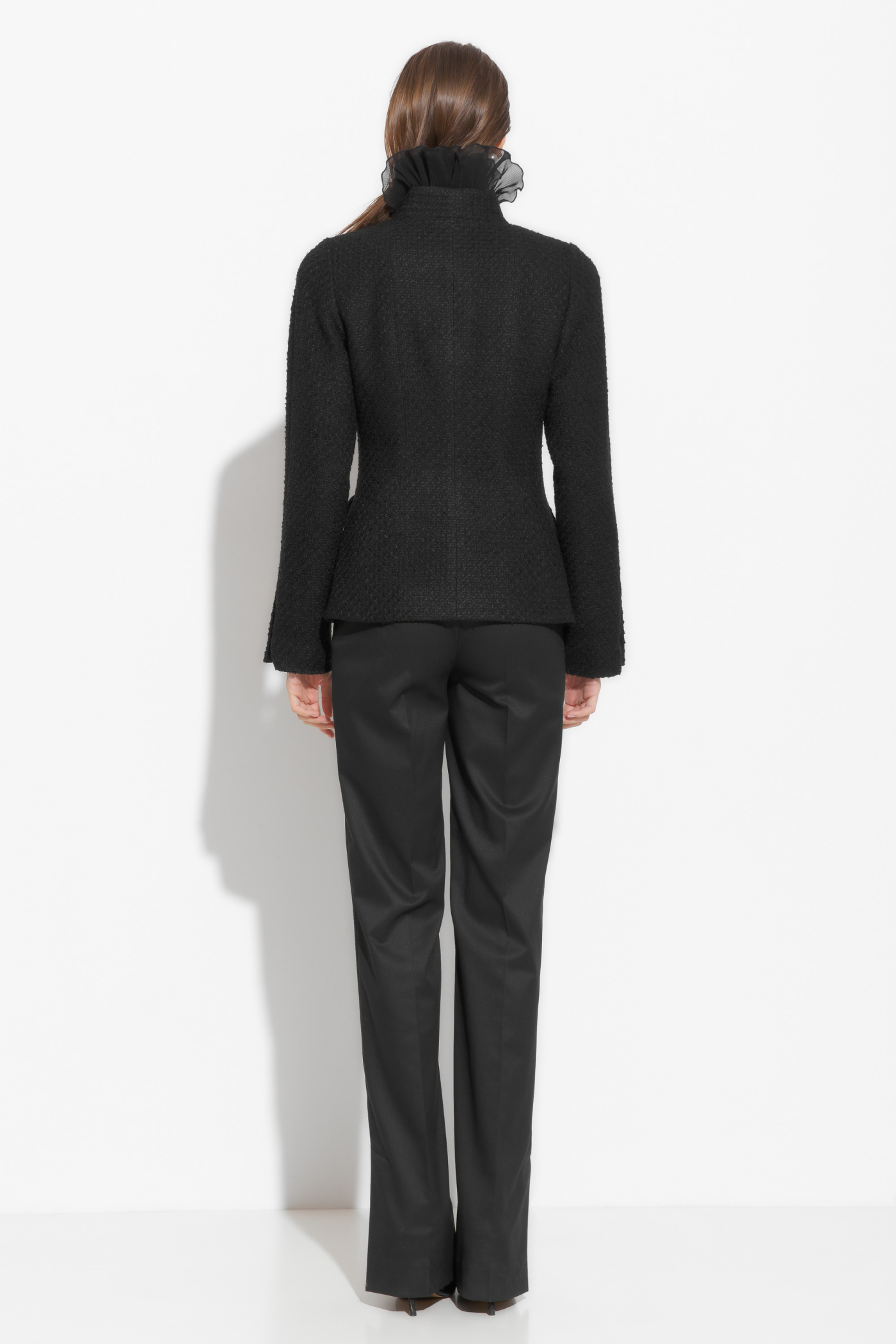 Жакет твидовый полуприлегающего силуэта, длиной до середины линии бедер. Твидовая ткань добавляет образу элегантности и изысканности. Этот жакет – идеальная база для создания классических и трендовых образов.