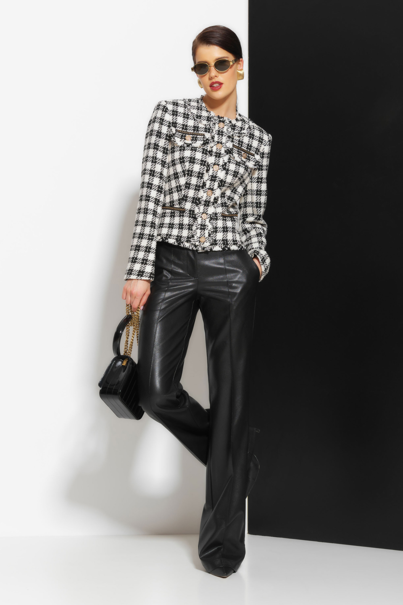 Жакет полуприлегающего силуэта, длиной выше линии бедер. Округлый вырез горловины. Края изделия декорированы бахромой. Акцентные пуговицы и классическая расцветка в клетку добавляют образу женственности и элегантности.