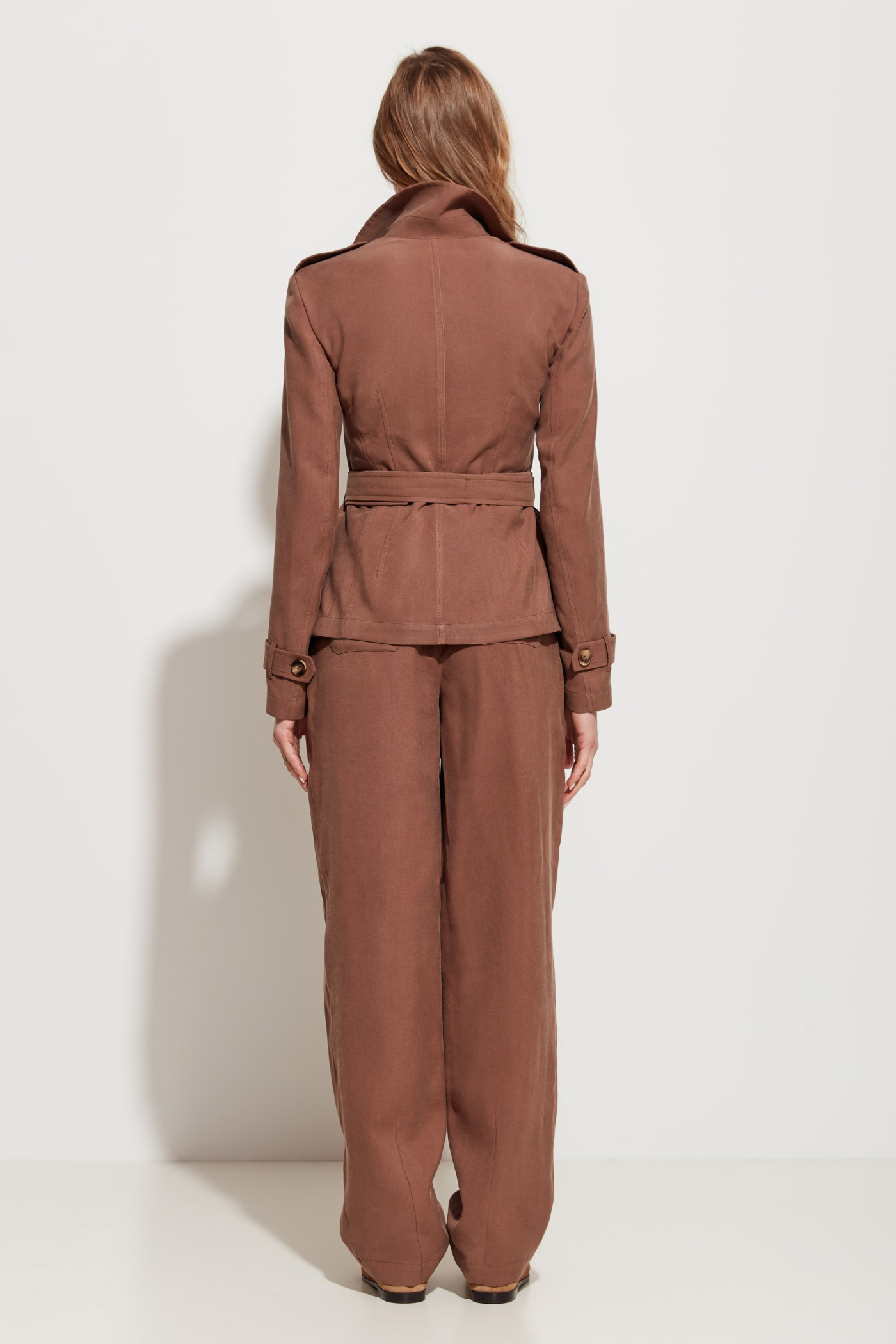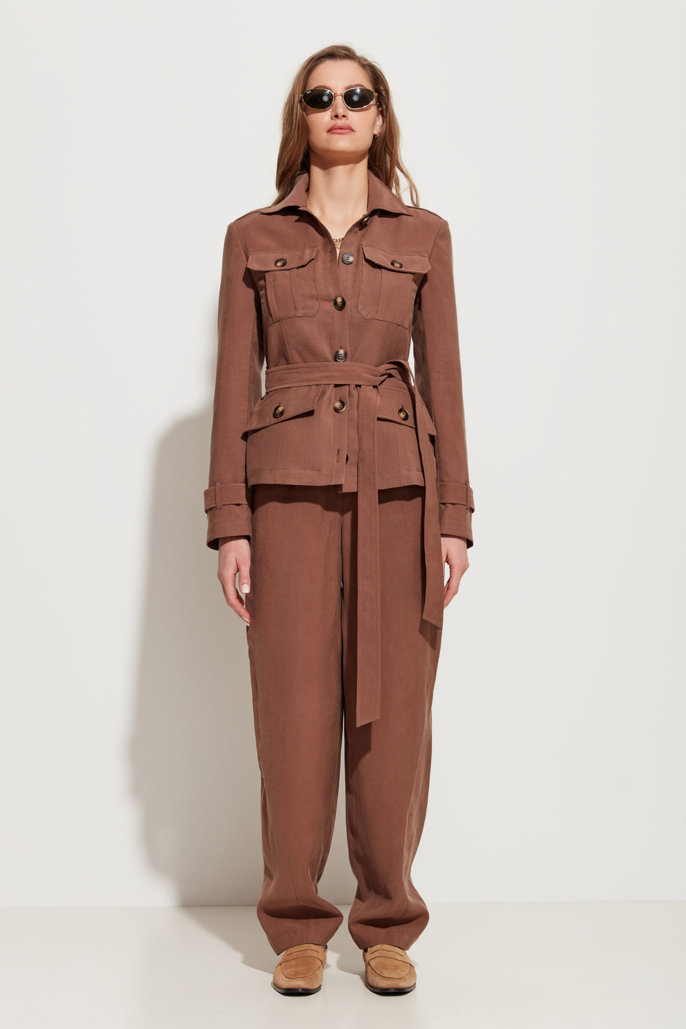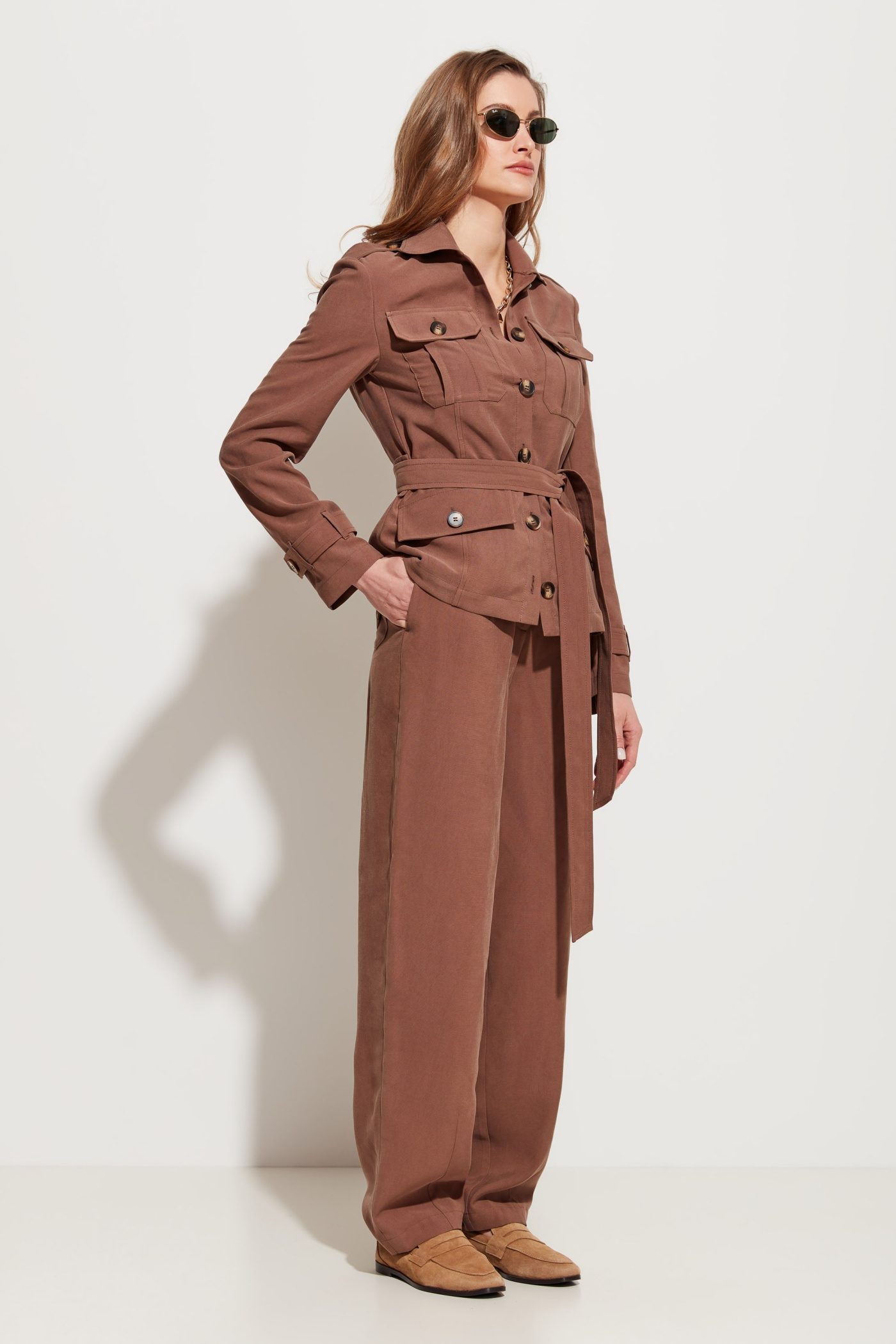 Жакет прилегающего силуэта, длиной до линии бедер. Воротник отложной. Спереди накладные карманы с клапанами. Объем талии регилируется при помощи съемного пояса из аналогичной ткани. Классическая модель, которая идеально сочетается как с брюками и джинсами, так с юбками и шортами.